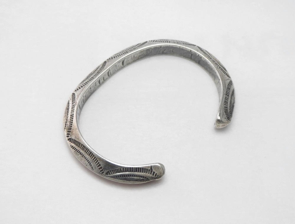 【NAVAJO】ナバホのアンティークジュエリー、インゴットシルバー(銀塊)から成形された硬く大変重厚なトライアングルワイヤー(竜骨型)をベースとした貴重なアンティーク/ビンテージバングルです。