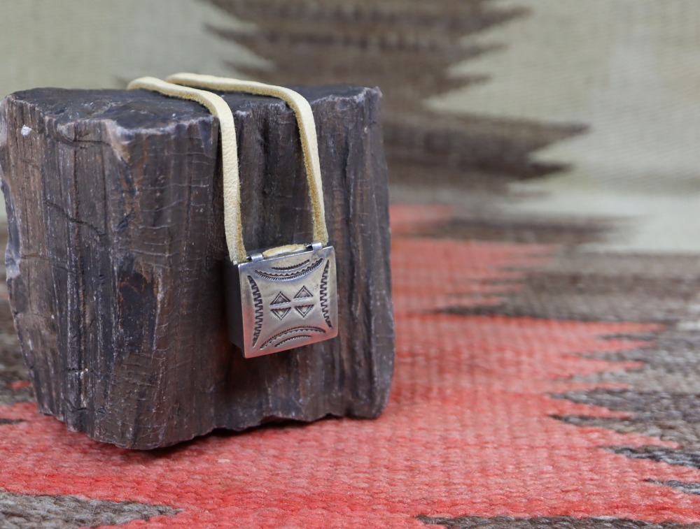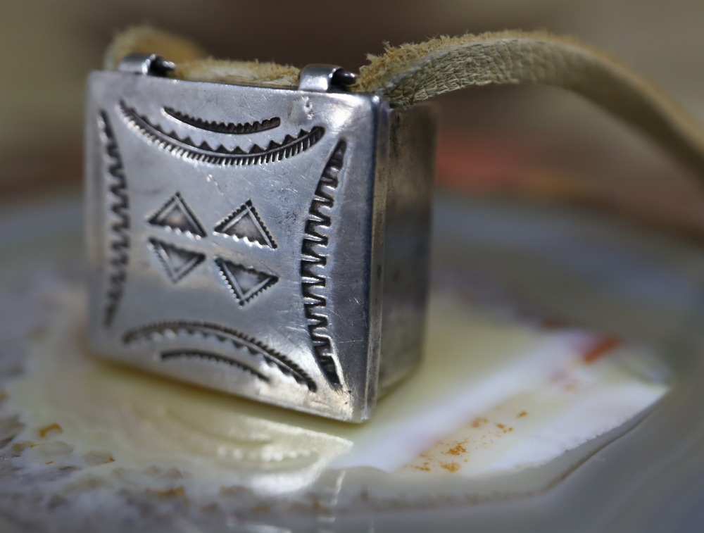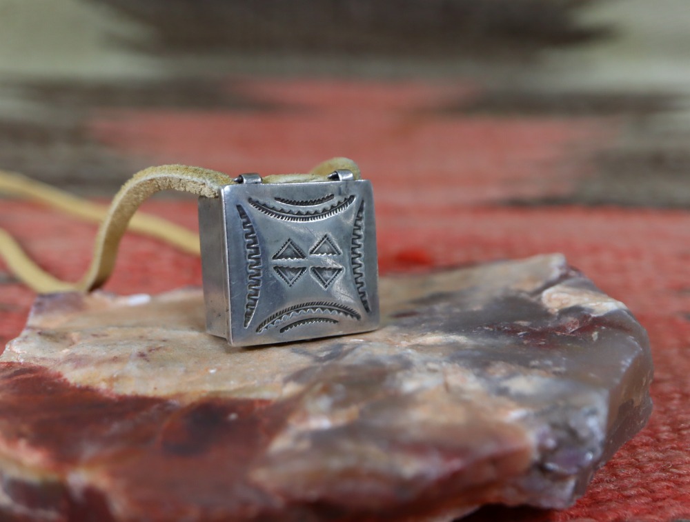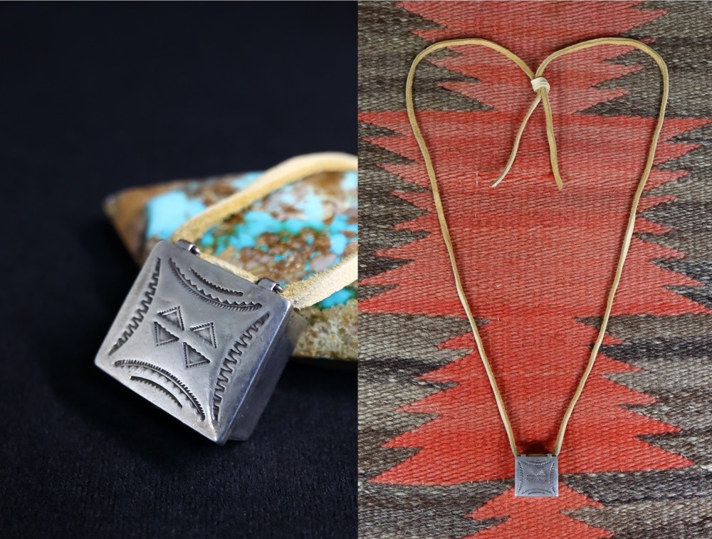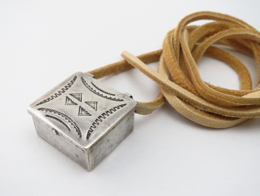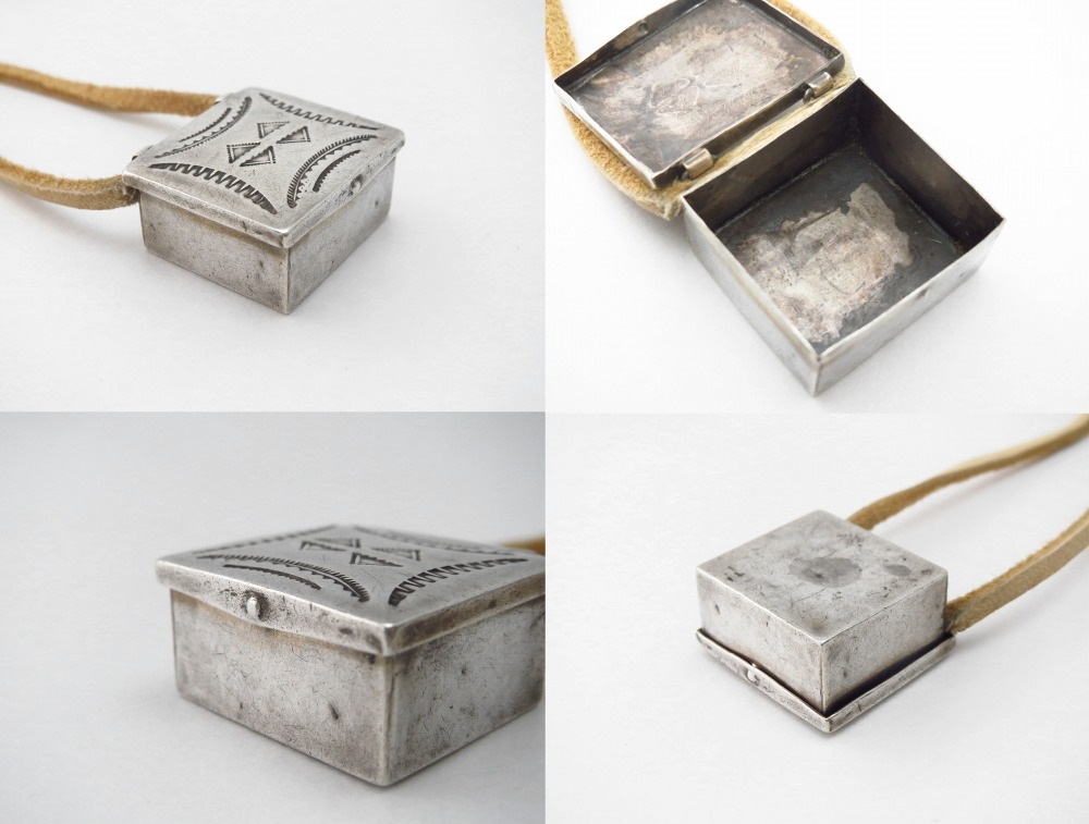 武骨ながら非常に精巧なシルバーワークと、奥行きを生み出すアンティーク作品独特な質を有するスタンプツール(鏨・刻印)のクオリティにより、ピルボックスとしても大変秀逸な作品。それをトップに構成する事で、インディアンジュエリーとしては類を見ない楽しさと愛らしさを持つネックレスとなっています。