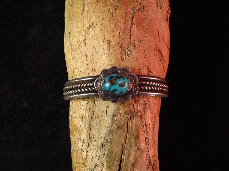 奥行のある表情を見せるツイステッドワイヤーをメインにしたシャンクに、ナバホの伝統的なフラワーコンチョが施された造形で、シンプルですがセンターのコンチョが楽しいデザインです。 今の気分にもフィットするデザインではないでしょうか。