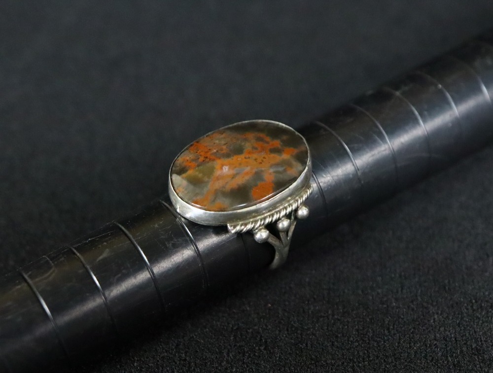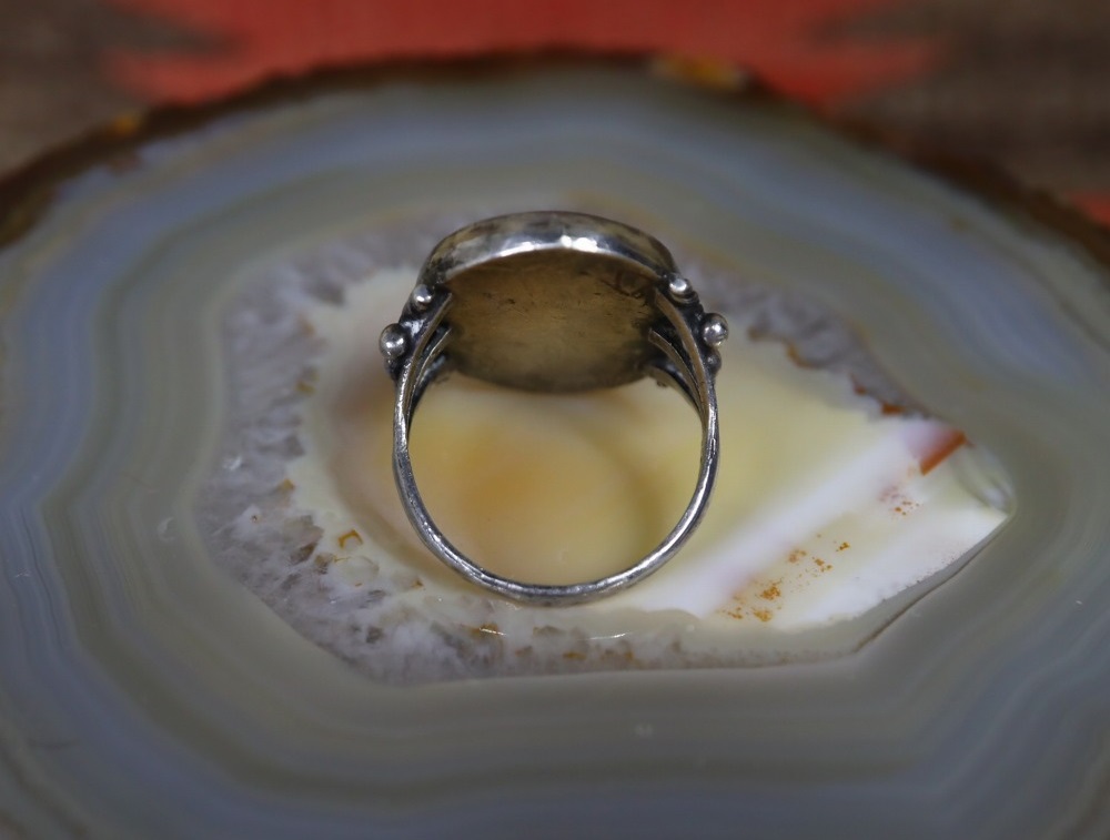 【NAVAJO】ナバホのアンティークジュエリー、とてもオーセンティックな造形のシルバーワークをベースに、深く強い透明感を持った暗褐色を基調としたオーバルカット【Petrified Wood】ペトリファイドウッド(木の化石)がマウントされたアンティーク/ビンテージリングです。