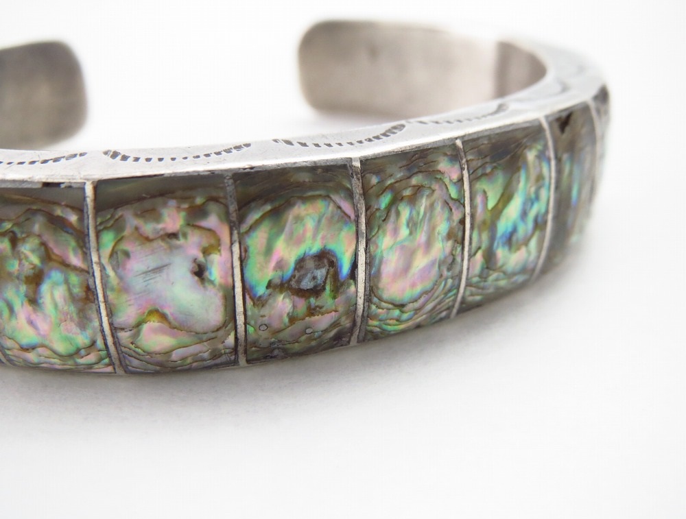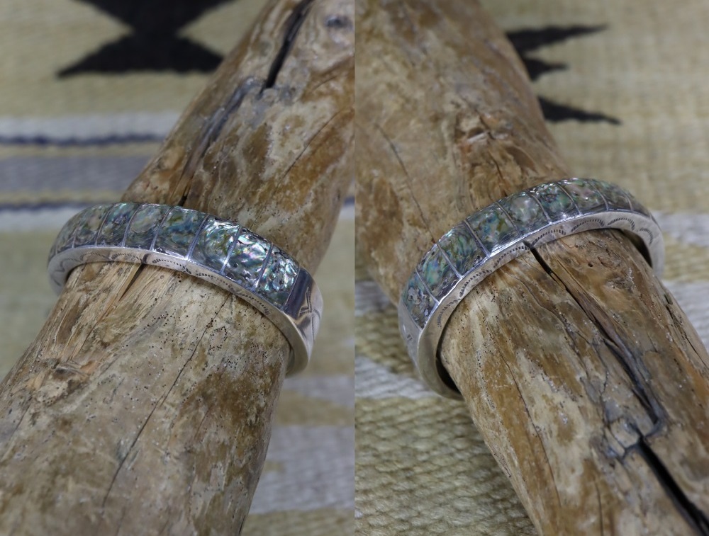 【ZUNI】ズ二のビンテージジュエリー、『ボックス構造』や『ホロースタイル』と呼ばれる高度なシルバーワークによって立体的な厚みが特徴的なバンドが形作られ、そこに複雑な表情を持ったアバロンシェル/孔雀貝がインレイされたアンティーク/ビンテージバングルです。