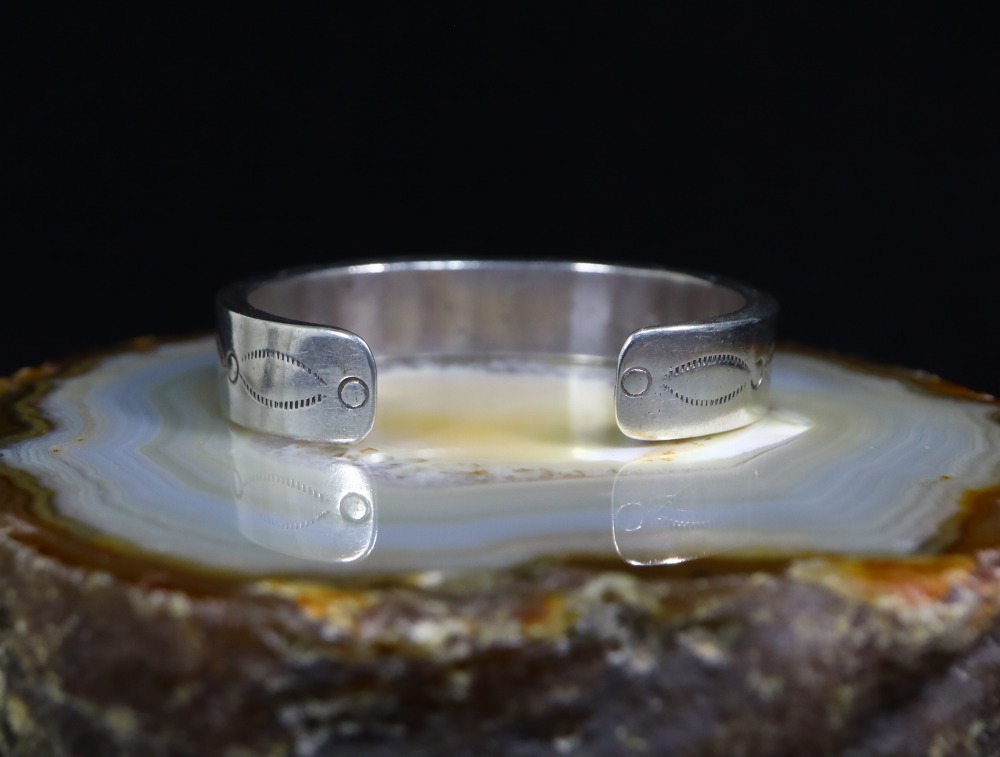 さらにバンド上下の分厚いエッジ部分とサイド~ターミナル(両端)にはスタンプワークが刻まれており、さり気ないディテールながら、ビンテージネイティブアメリカンジュエリーらしい表情が与えられています。