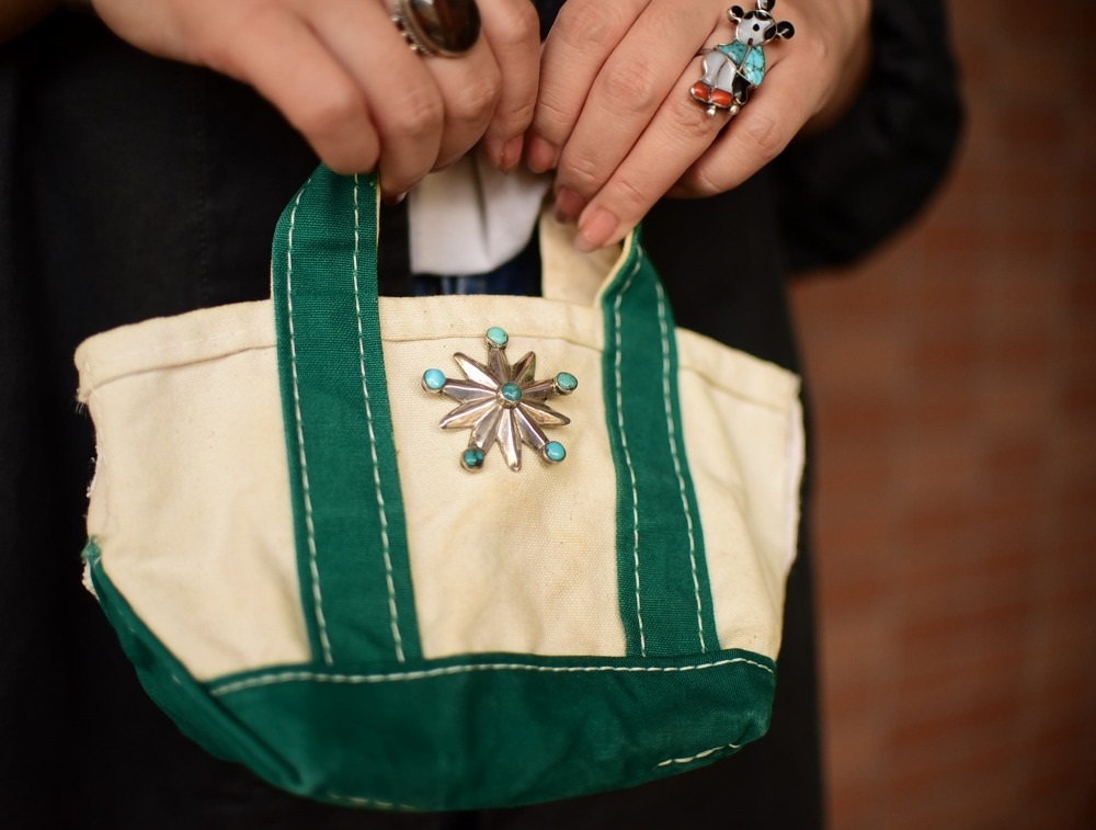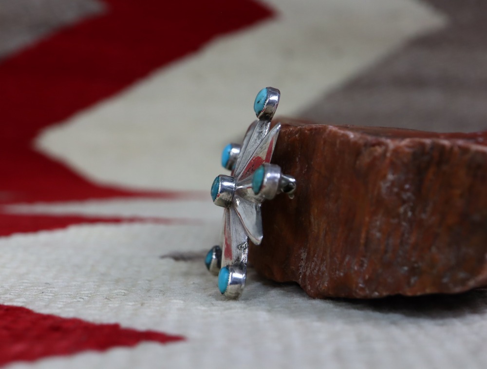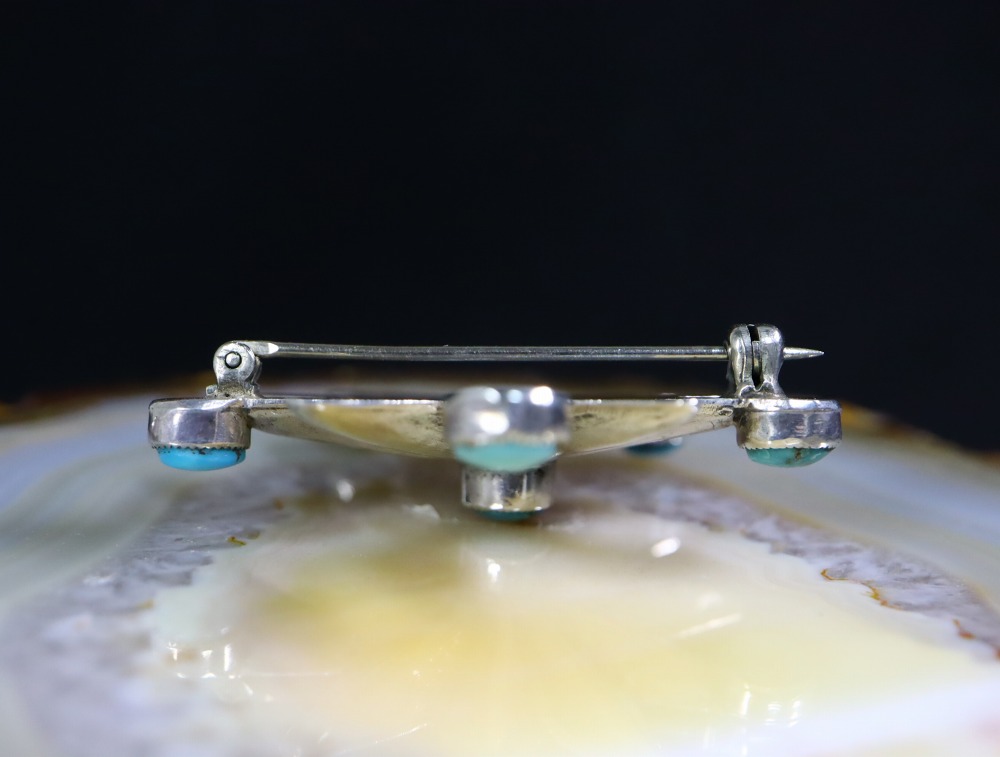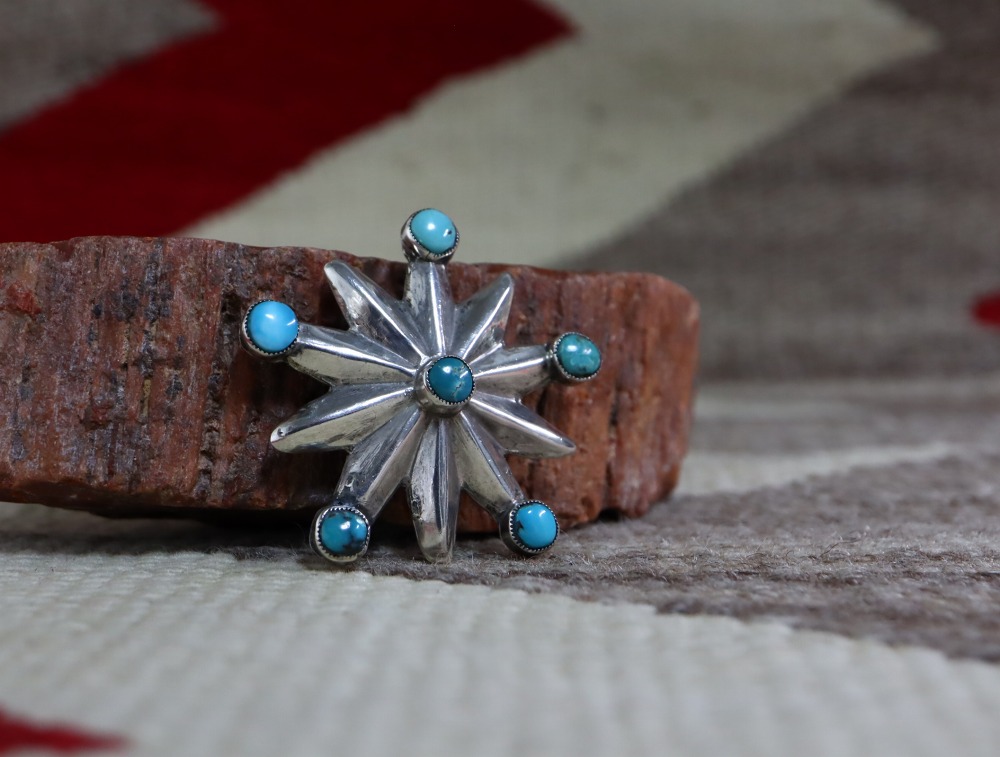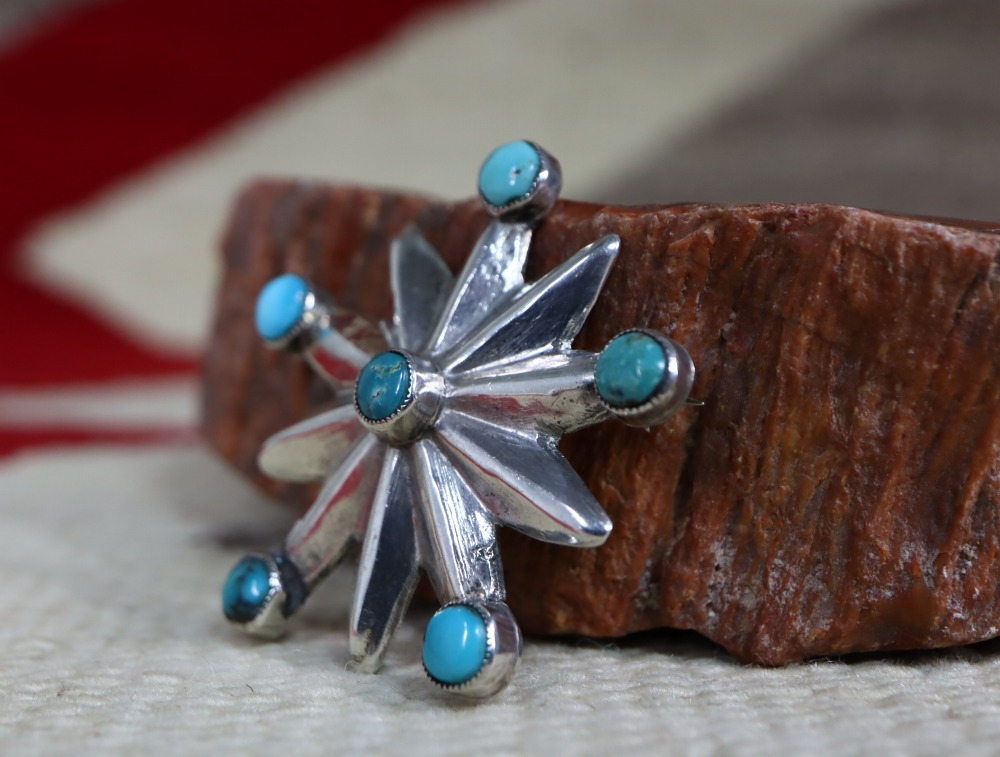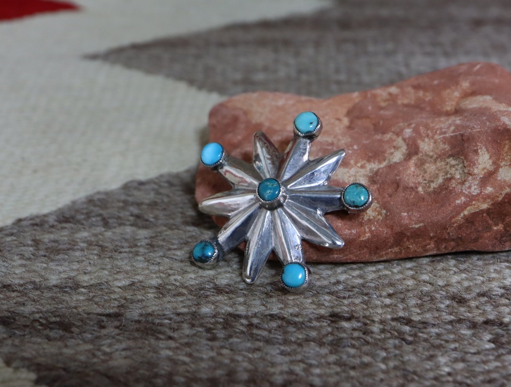 また、ナバホジュエリーを代表するでディテールデザインを用いた作品でありながら、その造形には唯一無二の独創性を持っており、同様の造形技法によるスターモチーフの作品は、今後の発見が非常に困難なとてもコレクタブルなアンティークピンブローチです。
