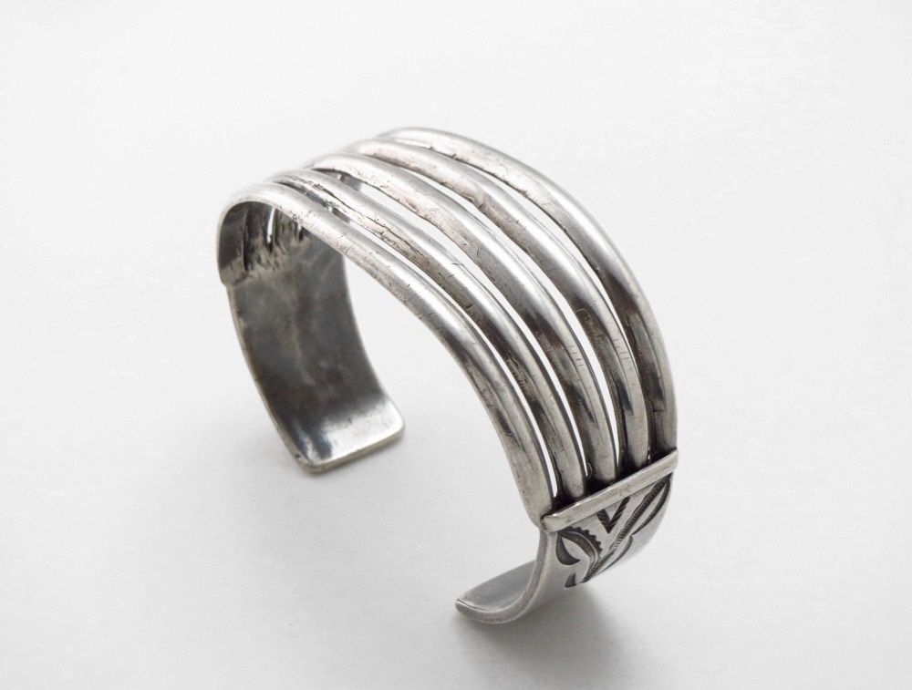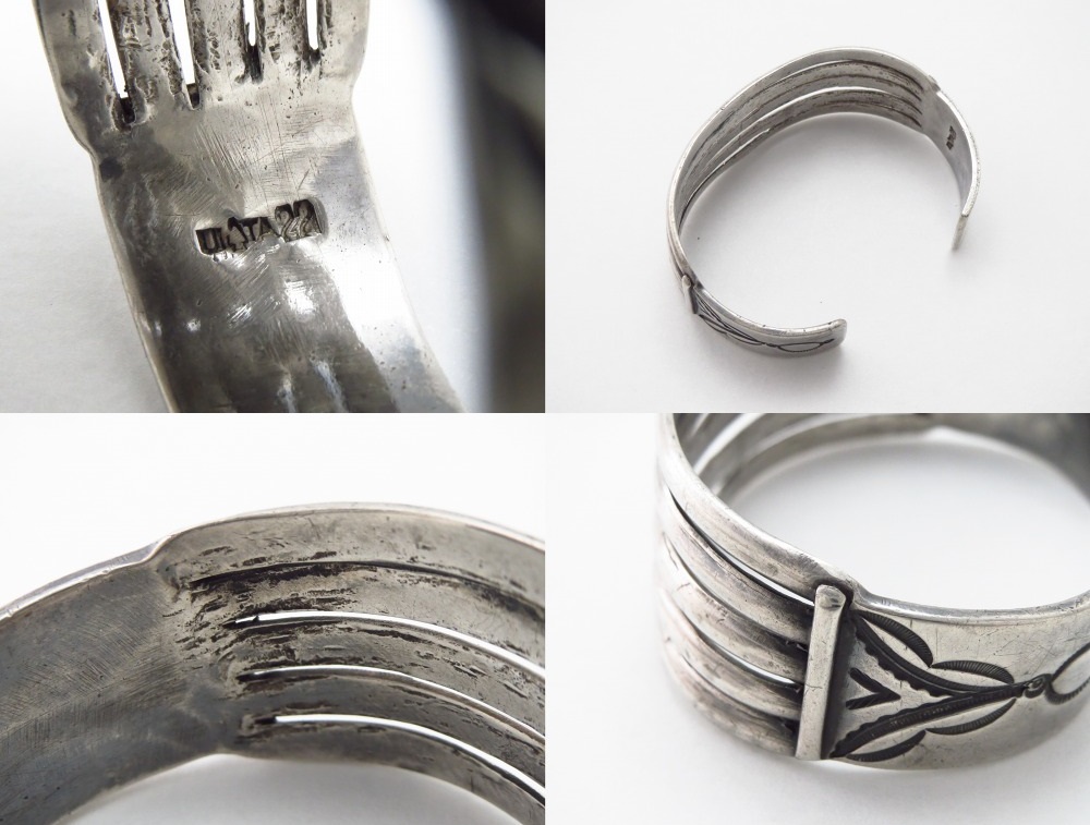 『UITA22』のホールマークにより1940年代後半~1950年代に作られた事が判断可能で、インゴットシルバー(銀塊)から成形されたバンドをベースとして、前述の通り鏨によって5本に割り開く事で荒々しくも端正で洗練されたスプリットバンドを形成しています。