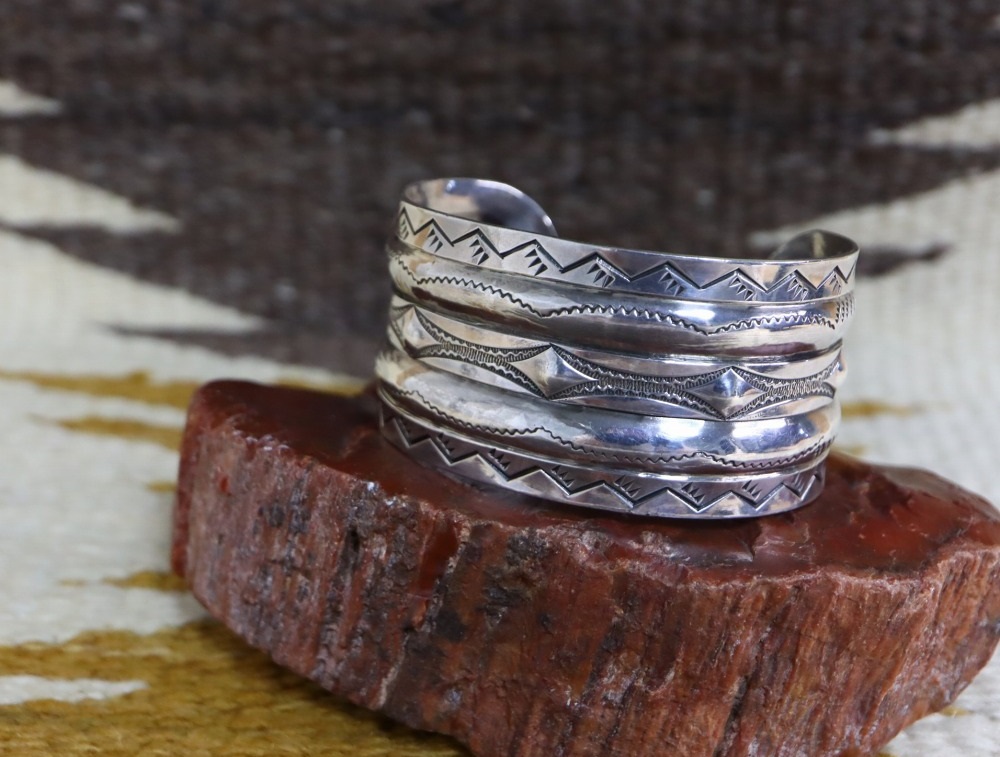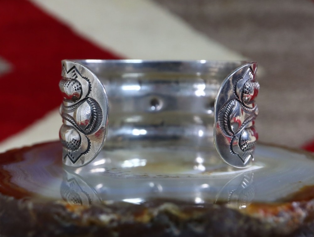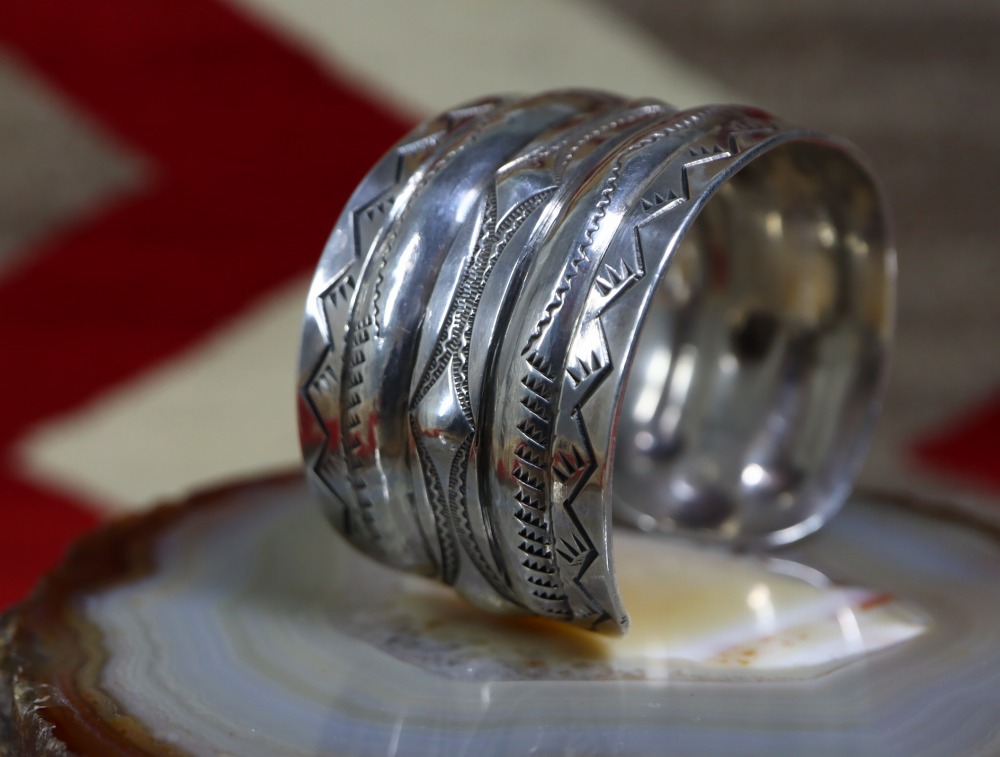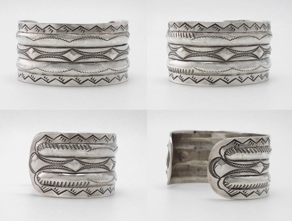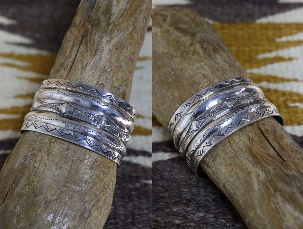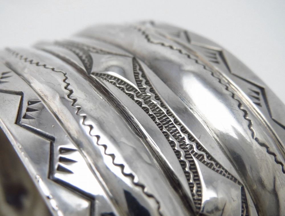【NAVAJO】ナバホの偉大な作家【Fred Peshlakai】フレッド・ぺシュラカイ(1896-1974)の作品で、リポウズ/バンプアウトによる立体的な2本のドーム状ラインがメインに構成され、秀逸なスタンプワークも素晴らしいアンティーク/ビンテージバングルです。