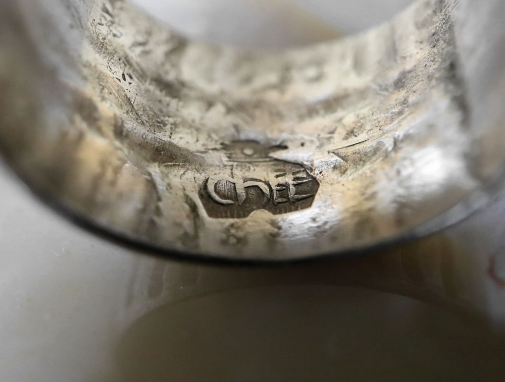 全体にシルバーのクスミが見られ、ロウ付け跡の目立つ仕上がりですが、これは後のサイズ直しではなく作者本人による仕上げの粗さによるものと思われます。