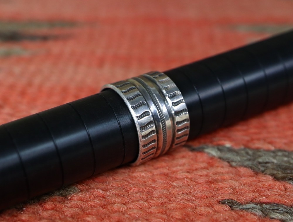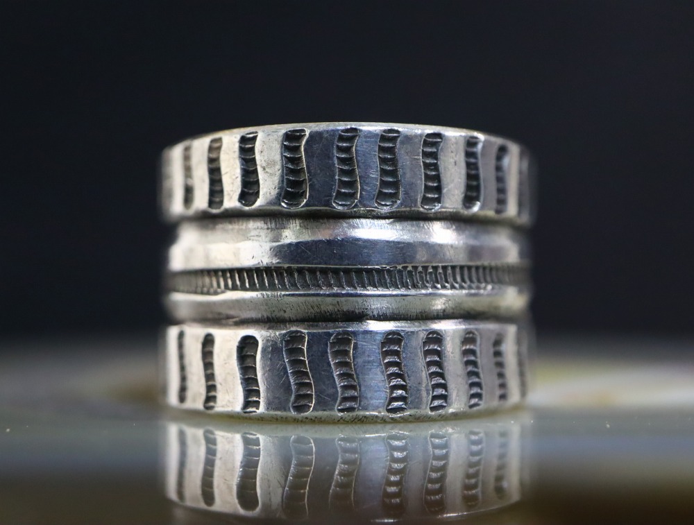そして、凸状に造形された中央のライン上には連続した刻みを含む直線的なスタンプワークが刻まれ、複雑な文様ではありませんが、奥行きがあり非常に力強いナバホらしさとシンプルで洗練された印象を生み出しています。
