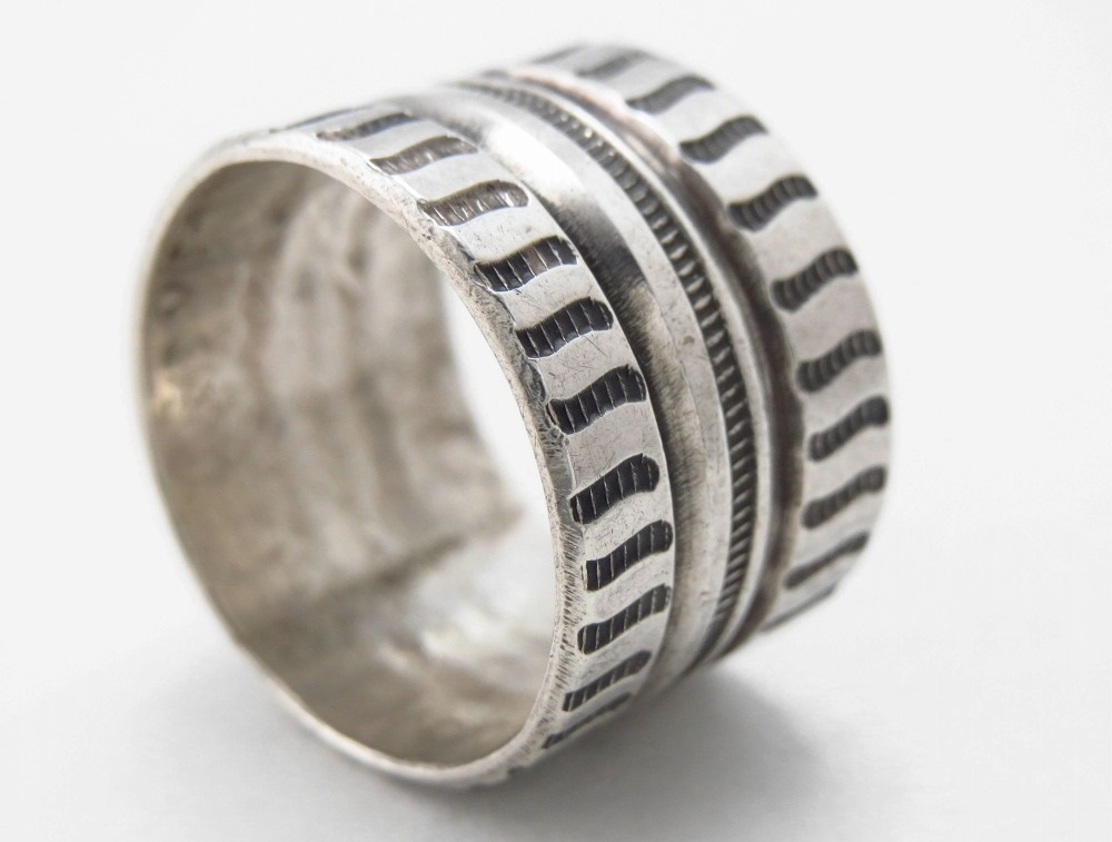【NAVAJO】ナバホの巨匠【Mark Chee】マーク・チーの作品で、立体的な造形を作るチェイシングや端正なスタンプワークによって形作られたハイエンドなアンティーク/ビンテージリングです。