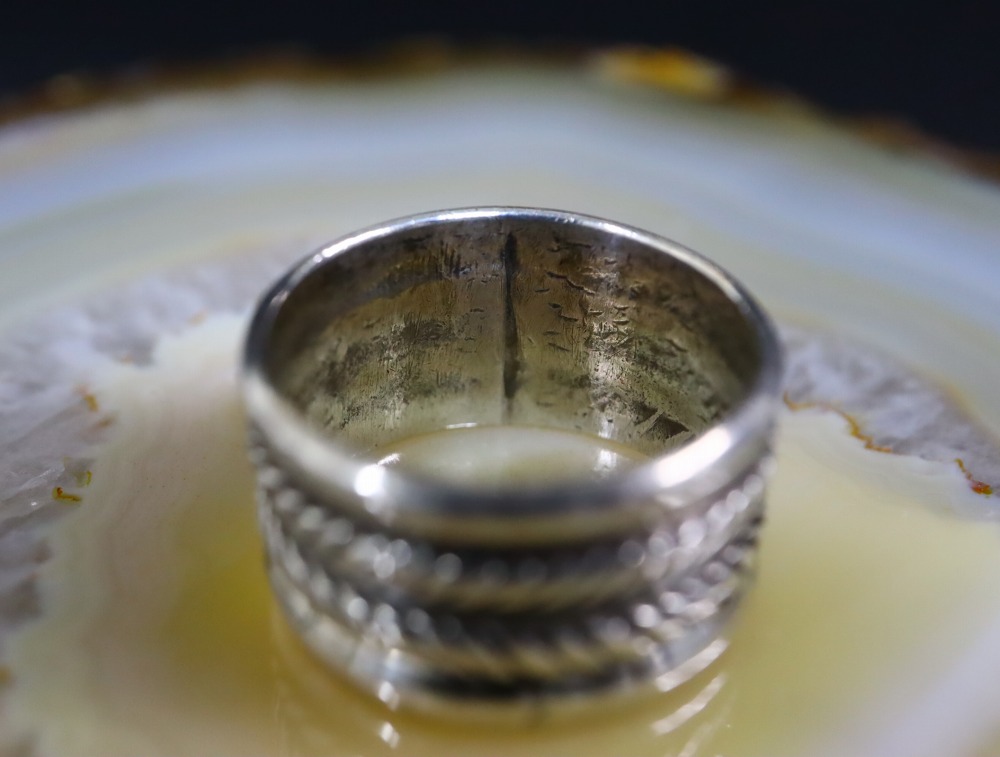 正確な制作年代の特定が困難なピースですが、1900年代~1920年代頃に制作された作品と思われ、『ワイドバンドリング』とも呼ばれるリングの全周が同一の幅でワイドな造形となっています。