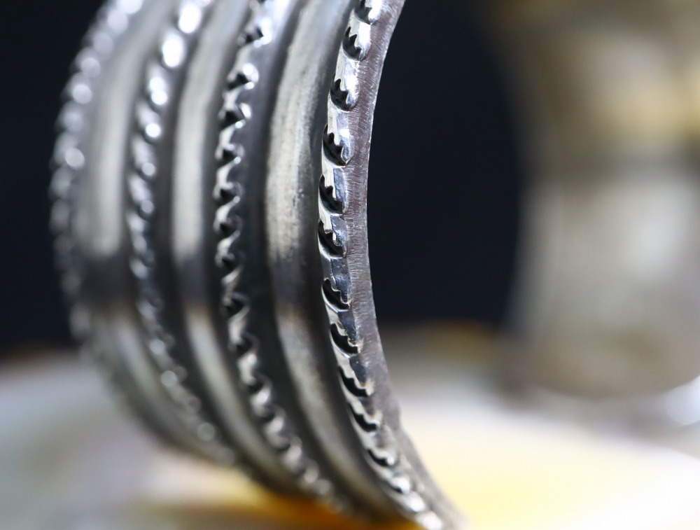 そこに『Chasing/チェイシング』と呼ばれる鏨を使いシルバーに立体的な角度を付ける(彫刻の様なイメージ)技術、さらに『ファイルワーク』というヤスリで削る原始的な技法を駆使することで、立体的な凹凸のボーダーラインが形成されています。