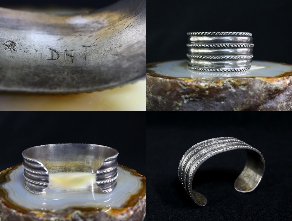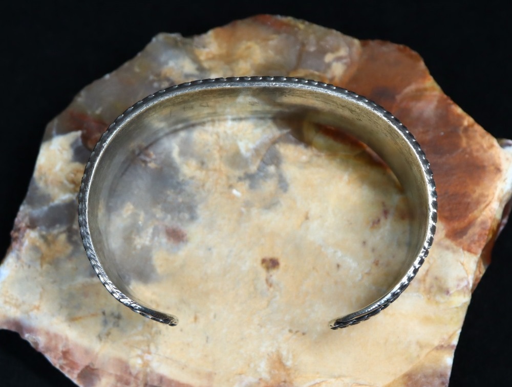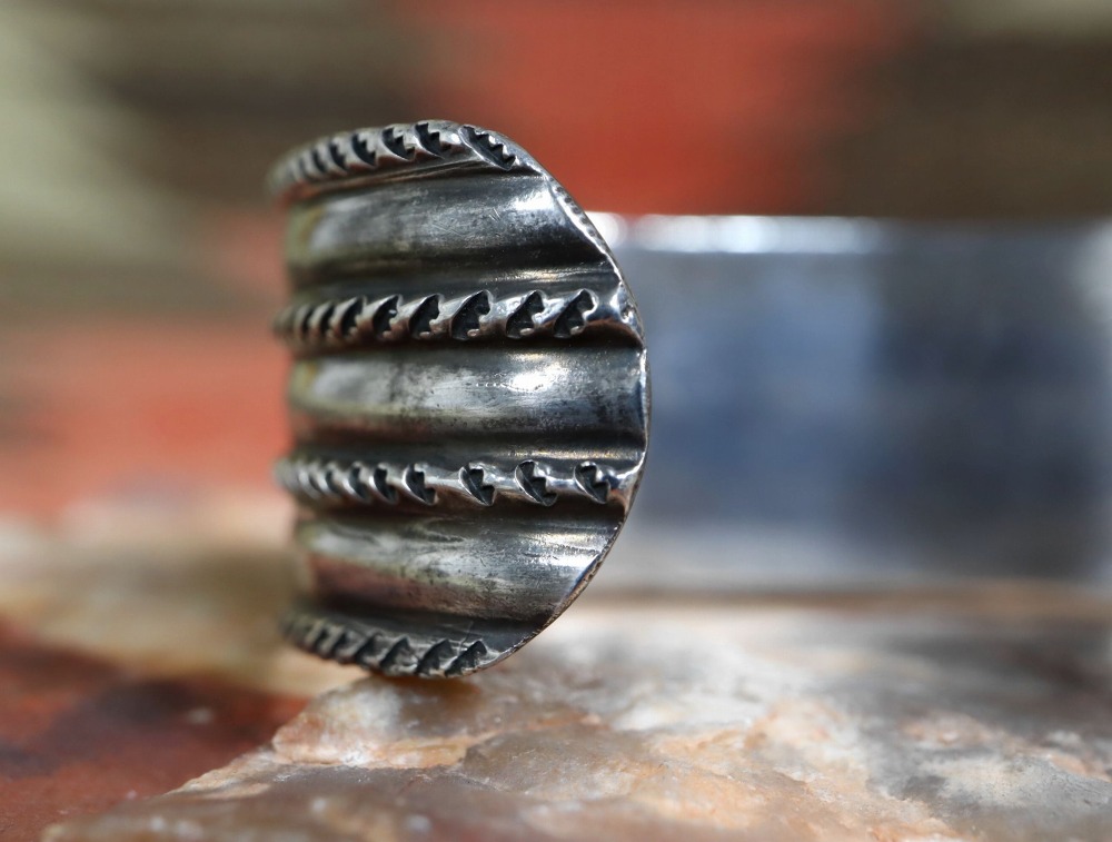 さらに、凹凸ライン上には細かなスタンプワークが刻まれており、その力強く細かく打ち込まれたスタンプワークからもナバホジュエリーらしさと、強い陰影と奥行きを生み出す作者の思いを宿すかの様なシルバーワークとなっています。
