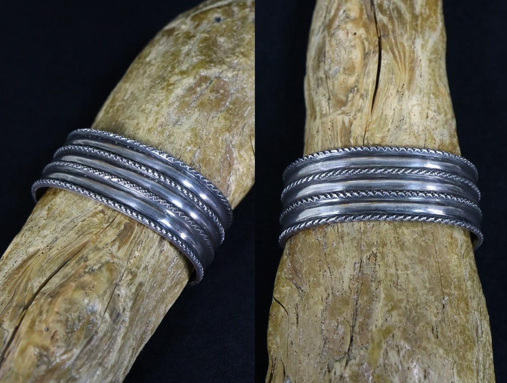 このような造形を実現する為には、高い技術力だけでなく力強くも繊細なハンマーワークと、それを継続して形作っていく為の集中力を必要とします。プリミティブながら作者の拘りやとてつもない技術力を垣間見ることが出来るシルバーワークにより作り上げられたブレスレットです。