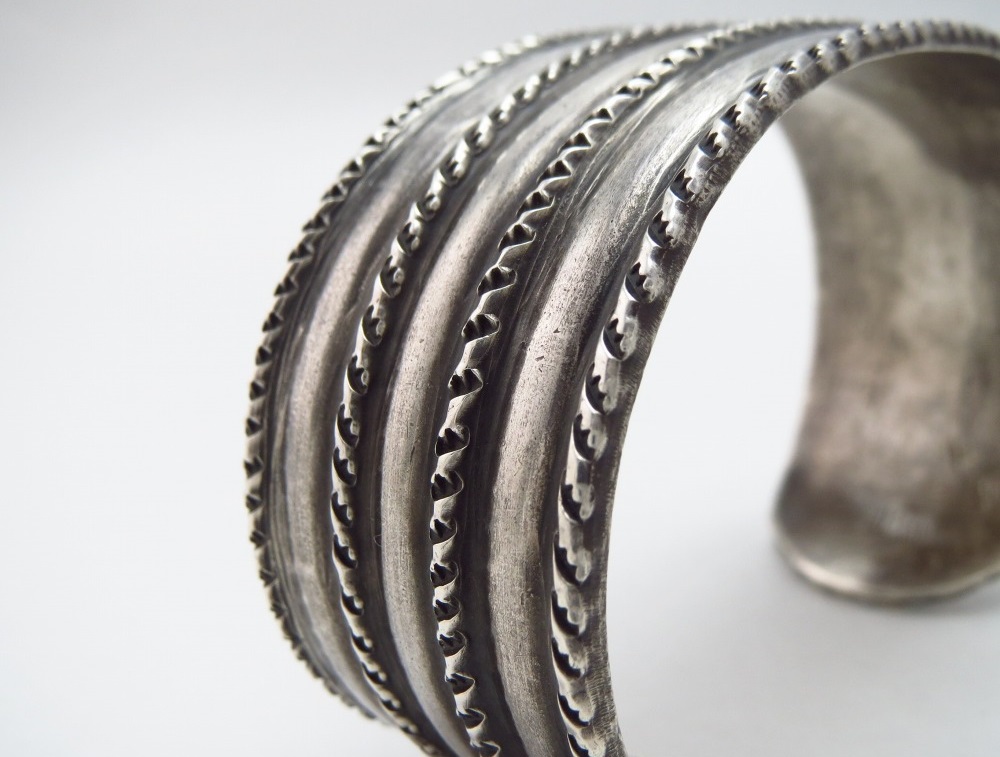 【NAVAJO】ナバホか【PUEBLO】プエブロのアンティークジュエリー、インゴットシルバー(銀塊)から成形された非常に重厚なバンド(地金)をベースに、大変力強く高い技術力を感じさせるチェイシングやスタンプワークで構成されたアンティーク/ビンテージバングルです。