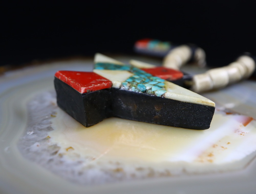 インディアンジュエリーにおいては、1930年代以前のからみられるもので、前述の通り、古くは本作のようなバッテリーバードネックレスなどに用いられています。破砕タイルのように細かくランダムに破砕された石がはめ込まれることにより、複雑で奥行きのある表情を作り上げています。