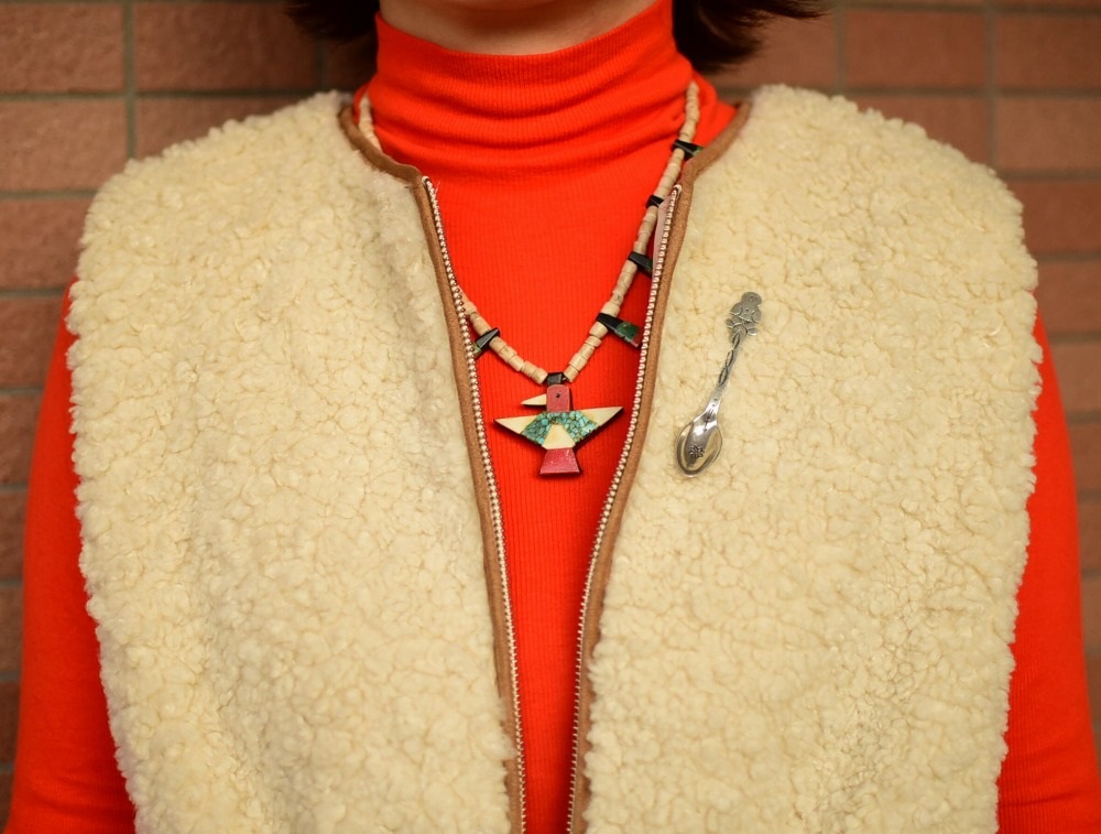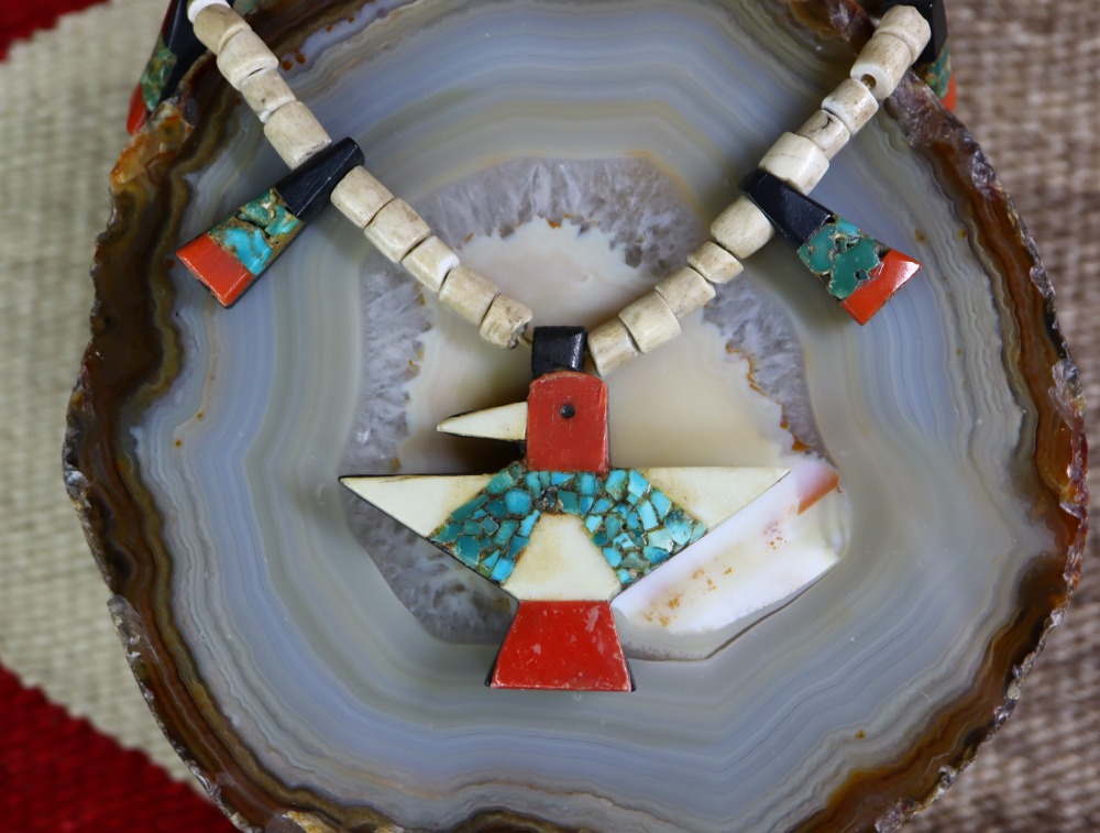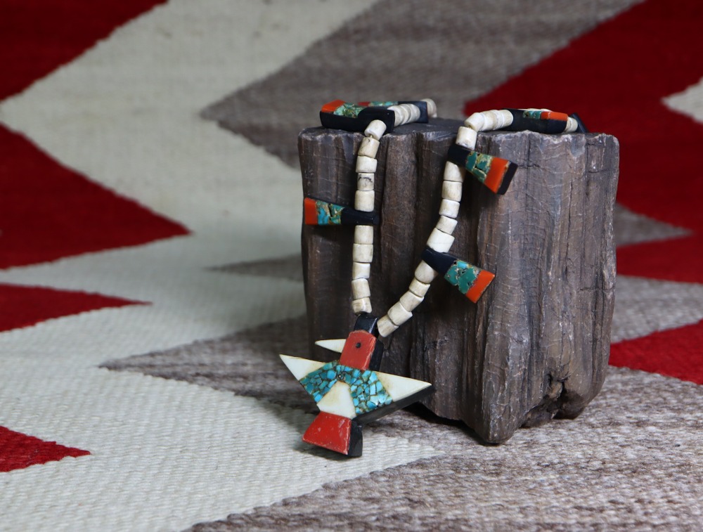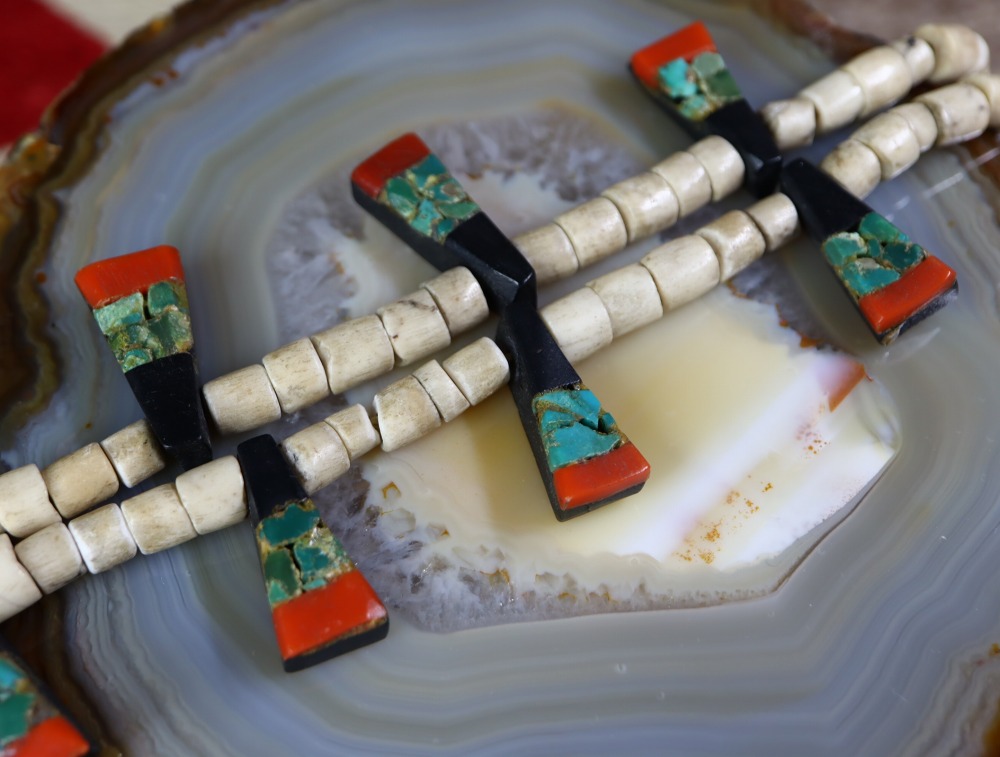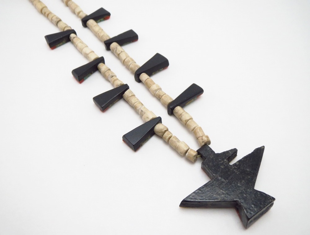 また、ナバホやホピ、ズニのジュエリーとも相性が良く、日常のコーディネートのキャッチーなアクセントとなり得るネックレス。エスニシティな魅力と、歴史的な工芸品を身に付ける事が出来る高揚感を与えてくれる作品です。