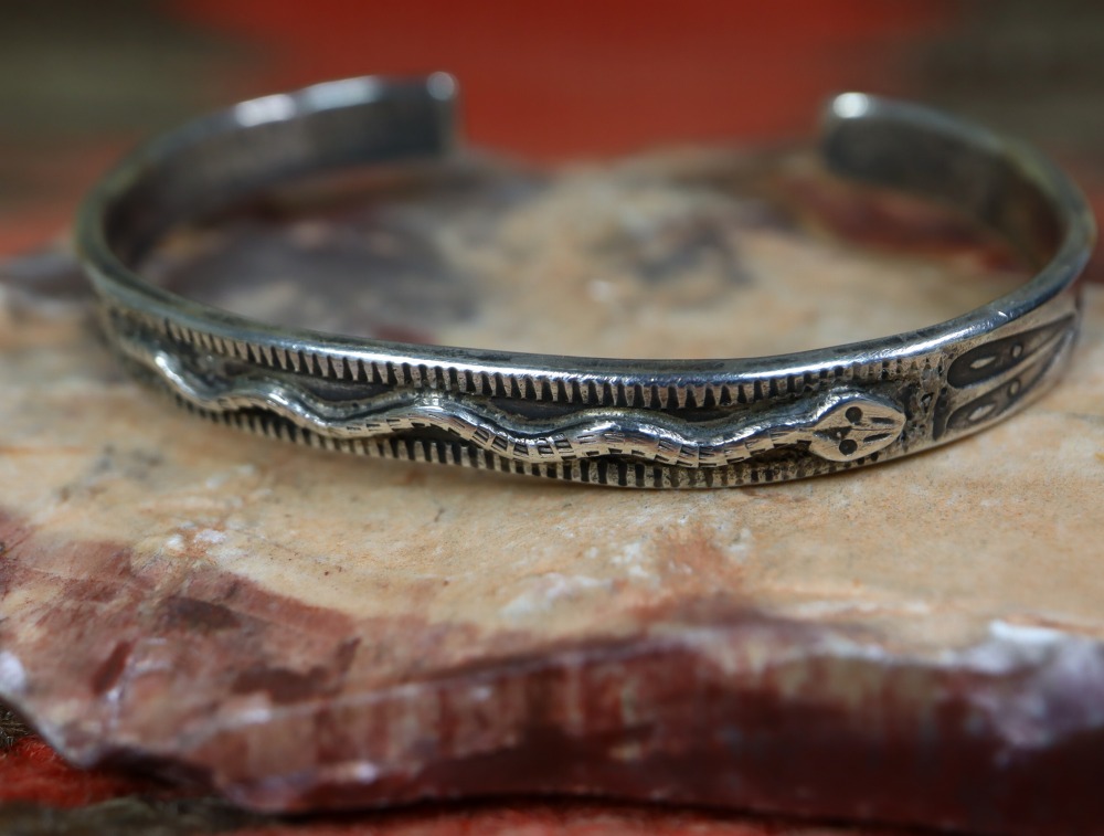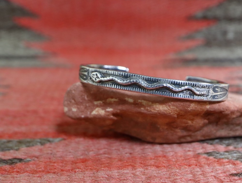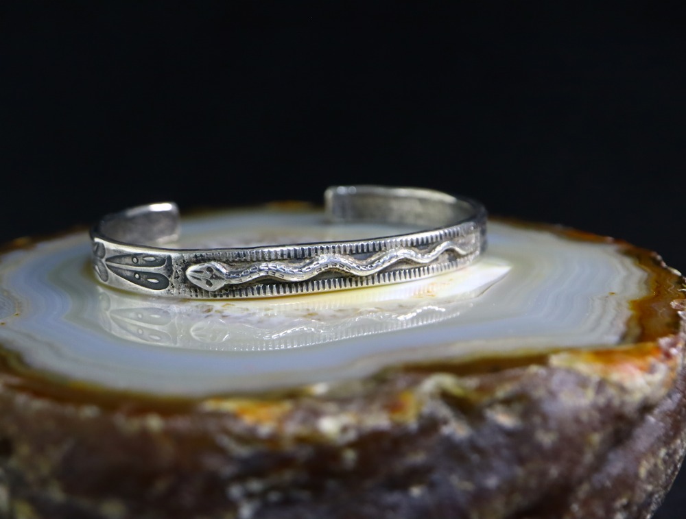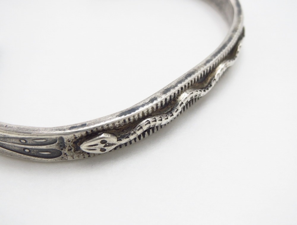 【PUEBLO】プエブロか【NAVAJO】ナバホのアンティークジュエリー、インゴットシルバー(銀塊)から成形された細く厚いバンドをベースとし、規則的に蛇行する躍動的なラトルスネーク/ガラガラ蛇のアップリケがメインに構成されたアンティーク/ビンテージバングルです。