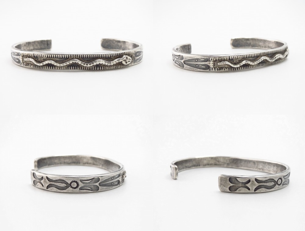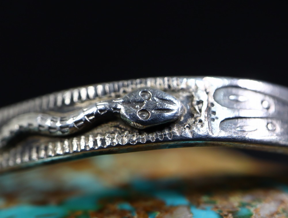 ジュエリーにおいてはナバホの偉大な作家【Fred Peshlakai】フレッド・ぺシュラカイ(1896-1974)やアコマの伝説的な作家【Clyde Hunt/Chief Sunny Skies】クライド・ハント(1900-1972)等が素晴らしいスネークモチーフの作品を残しており、それらのデザイン・スタイルが後世に受け継がれています。
