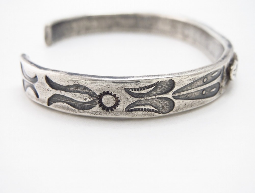 またそのサイド~ターミナルにかけても力強く独特なスタンプワークが刻まれており、そのナバホジュエリーとは異なったスタンプツール(鏨・刻印)の意匠により、本作の制作背景が推定可能となっています。