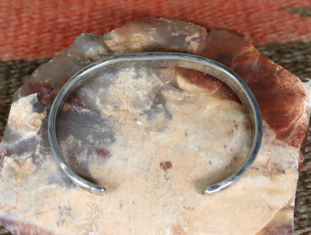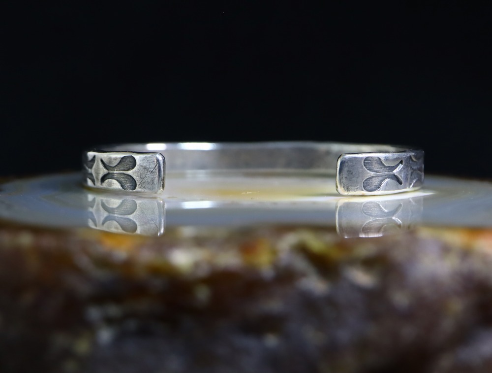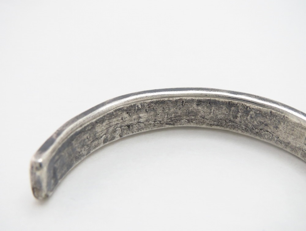 1930年代中頃~1940年代に作られた作品で、インゴットシルバー(銀塊)から成形されたバンドはパウンディングを感じさせる固く滑らかな質感となっており、細い幅でありながらずっしりとした重量感が心地よい造り。滑らかなシルバーの肌により腕への装着感も素晴らしいバングルです。