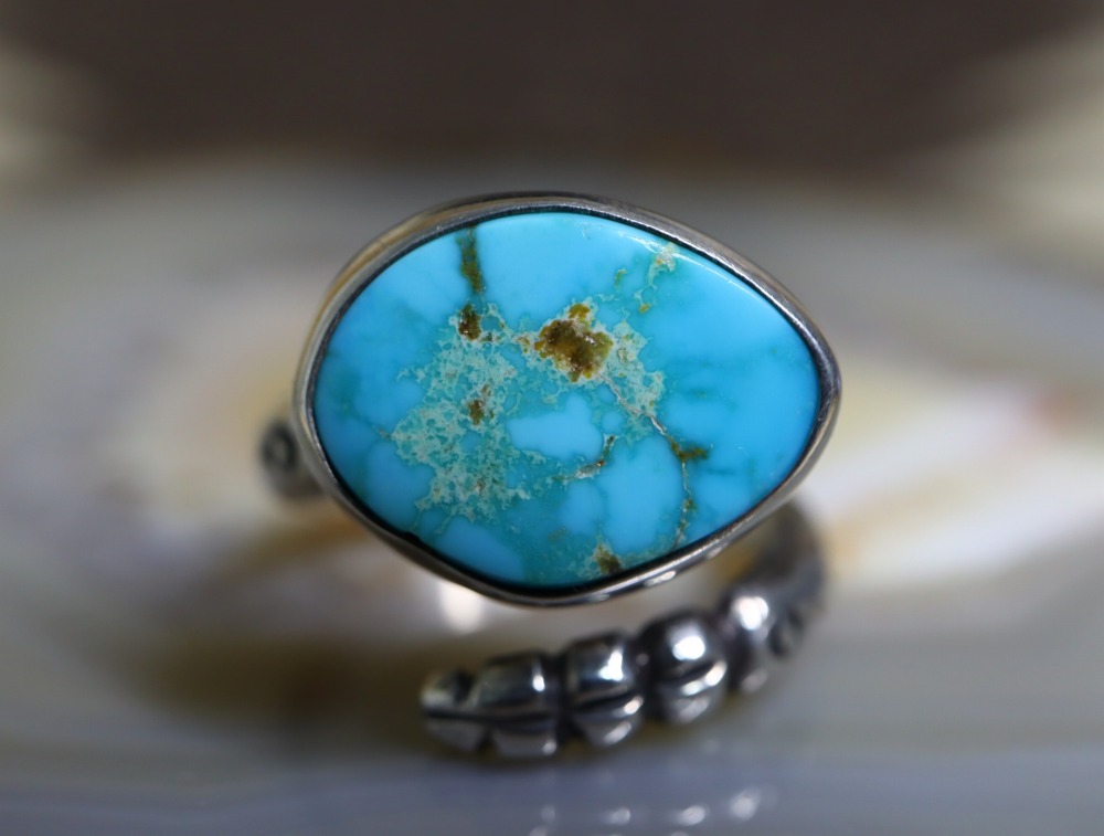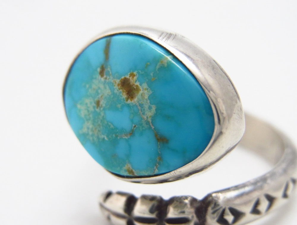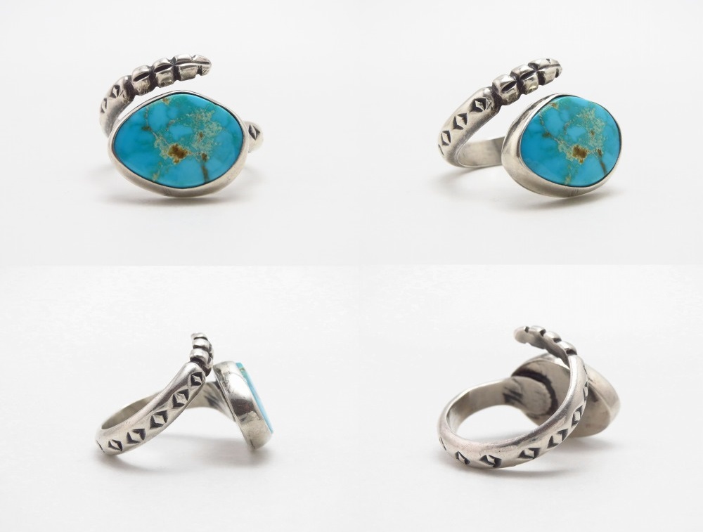 【PUEBLO】プエブロか【NAVAJO】ナバホのビンテージジュエリー、ラトルスネーク/ガラガラ蛇が指に巻き付く造形のシャンクに、美しいターコイズがマウントされたアンティーク/ビンテージリングです。
