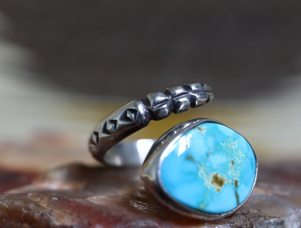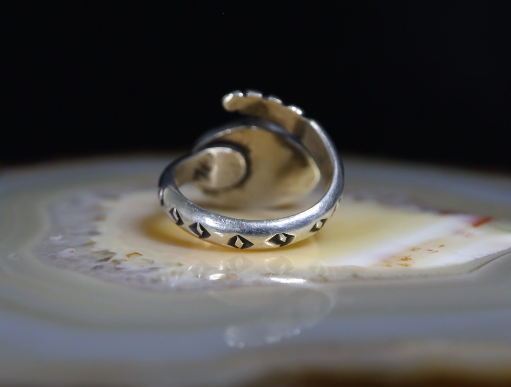 シルバーワークのクオリティも高いハイエンドなリングとなっており、この様なラトルスネークをモチーフにした『指に巻き付く造形スタイルのリング』は、ビンテージズニジュエリーにおいて散見されるデザインとなっており、本作もナバホジュエリーではなくズニを始めとするプエブロのシルバースミスによって作られた可能性の高い作品です。