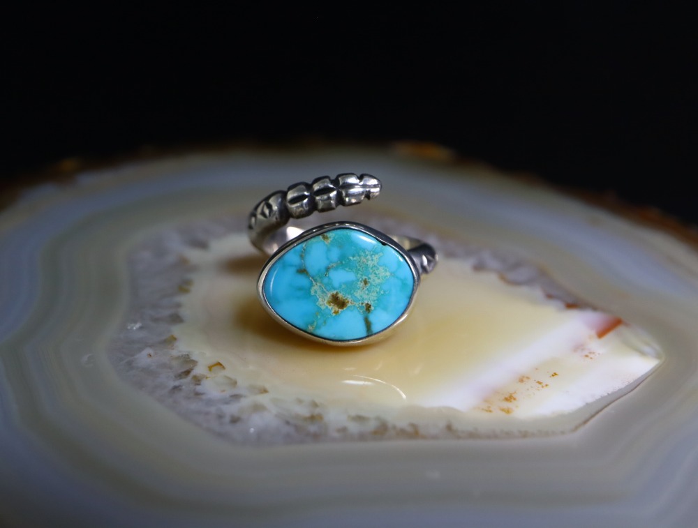 マウントされたターコイズは艶・発色・透明感が素晴らしい石で、比較的柔らな色相の澄んだ水色を基調とした石となっています。
