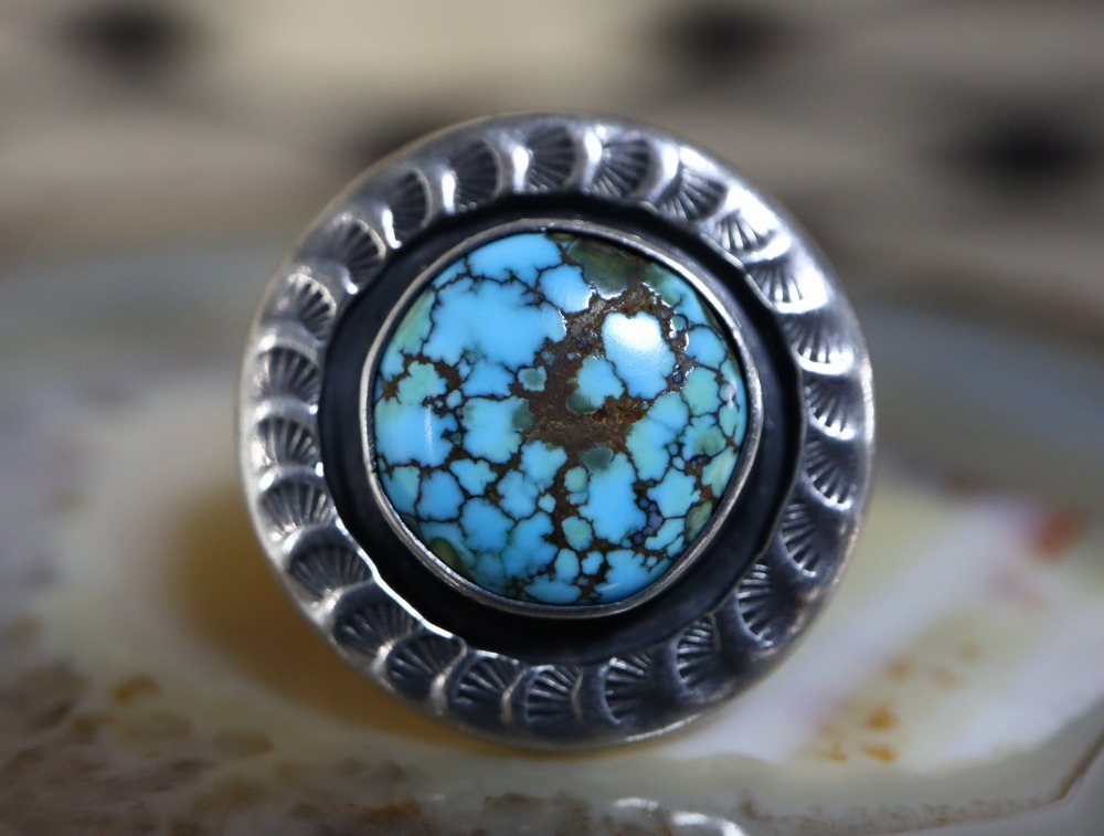 さらに、そのエッジ部分にはナバホジュエリーらしいスタンプワークが規則的に刻まれる事で、まるで蛇/スネークが巻き付いているような表情が生み出されており、ターコイズの質を活かしながらも作者のセンスを感じさせるスペシャリティを持った作品に仕上げられています。