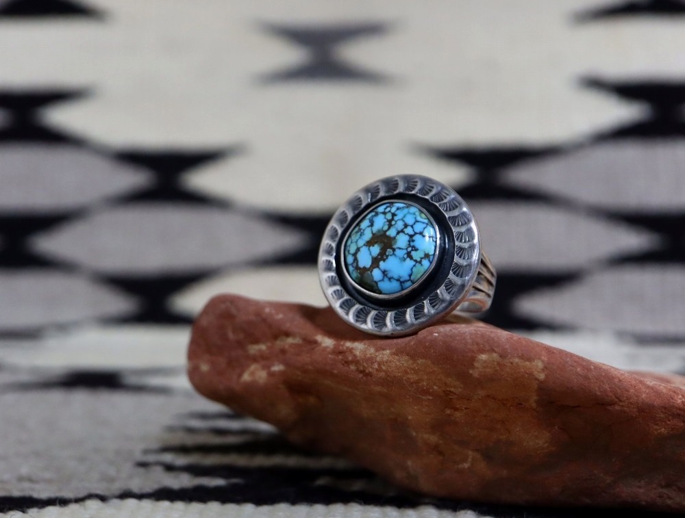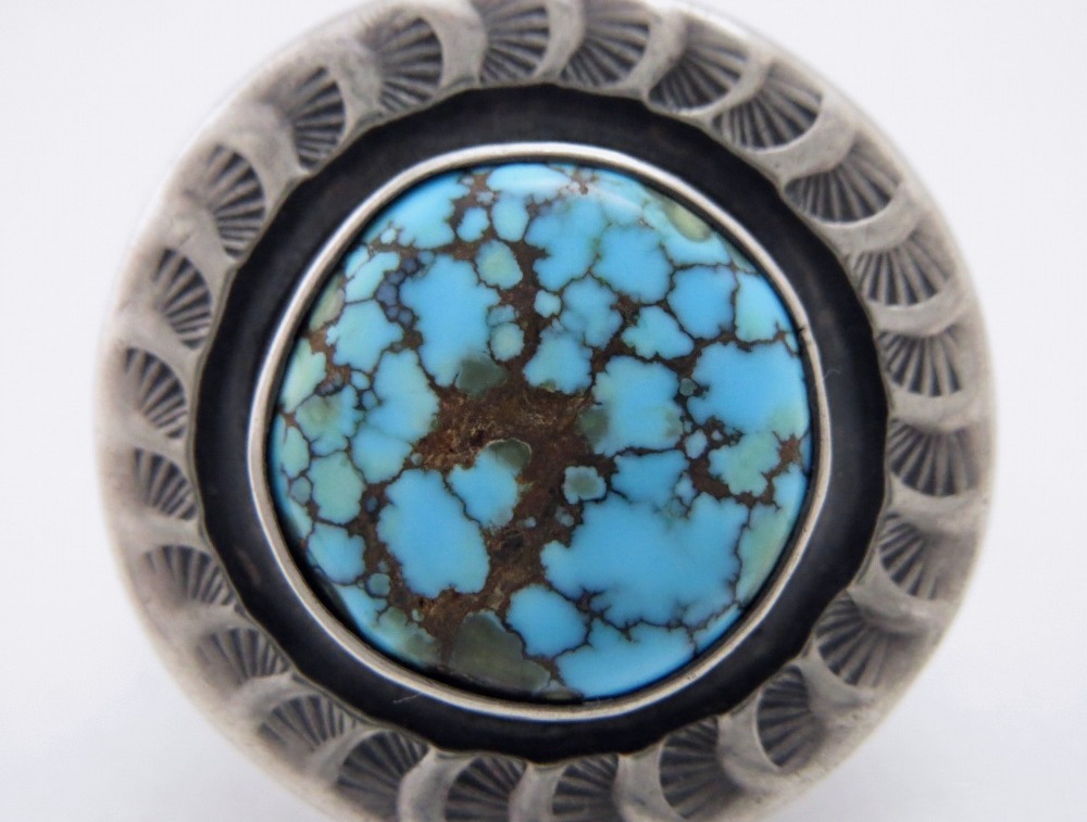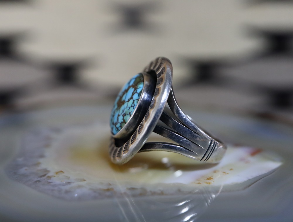 【NAVAJO】ナバホのアンティークジュエリー、非常に質が高く端正なシルバーワークをベースとして、美しい【Old Number Eight Turquoise】オールドナンバーエイトターコイズがセットされたハイエンドなアンティーク/ビンテージリングです。