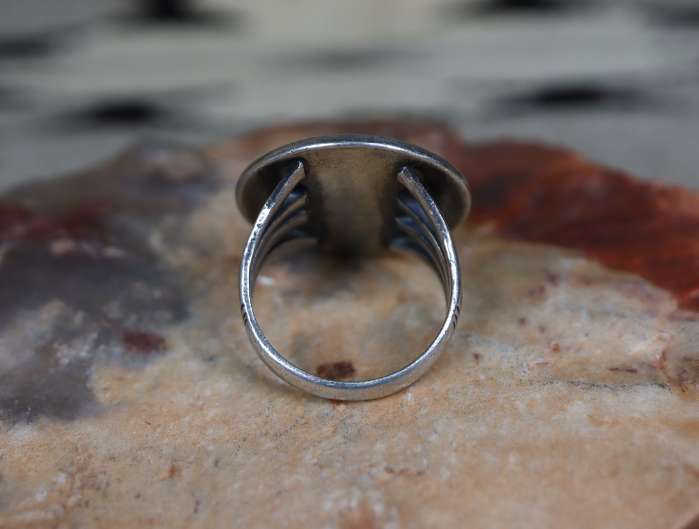 1930年代後半~1950年代初頭頃に制作されたリングと思われ、おそらくインゴットシルバー(銀塊)から成形されたシャンクは、フロントが『スプリットシャンク』と呼ばれる伝統的な造形で4本に割り開かれており、ラウンド型のフェイスに向けて自然な流れを生み出しています。