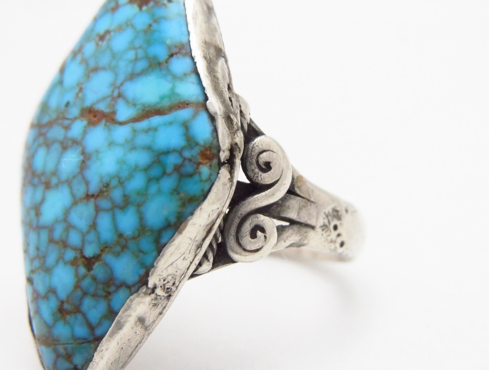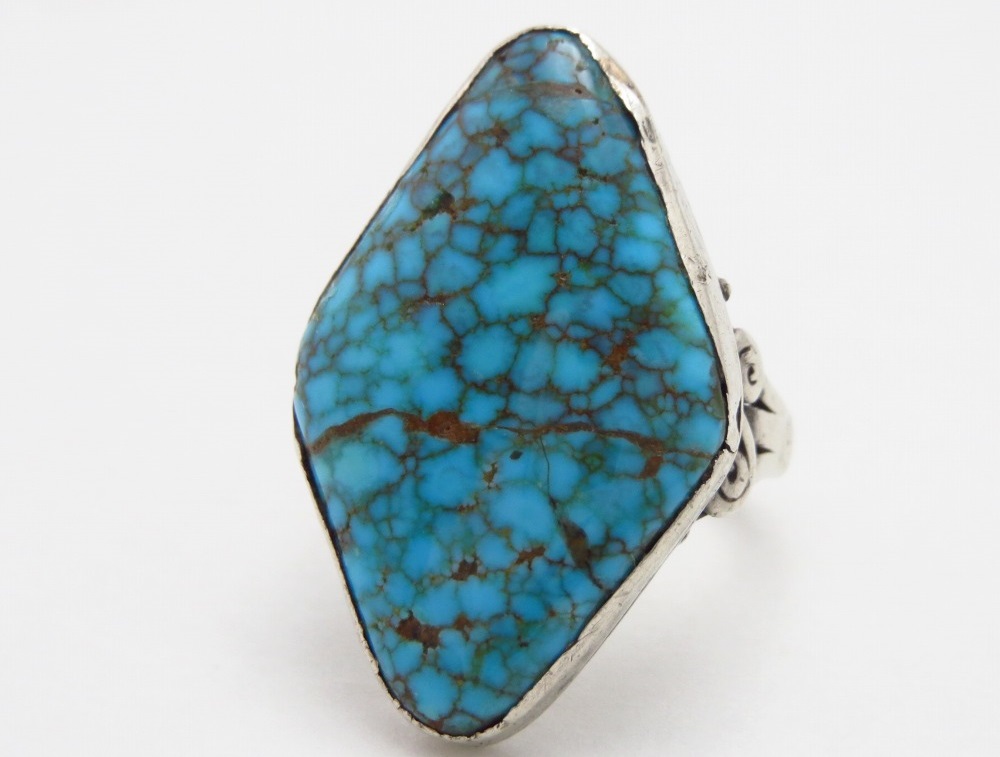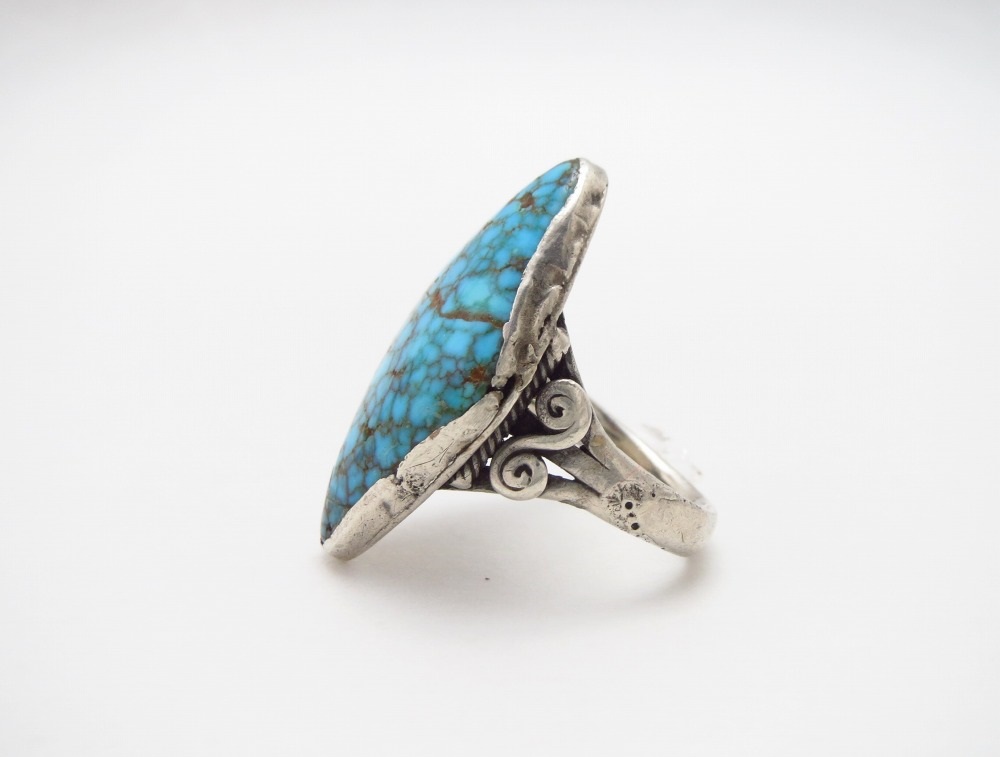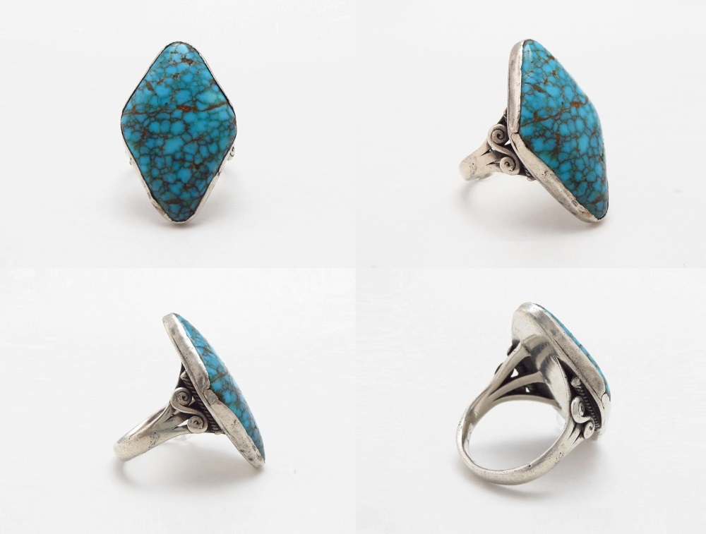 特にターコイズを留めるベゼル(覆輪)には欠損部分のリペア跡と思われる部分があり、シャンクにもリペアが施されているかも知れません。