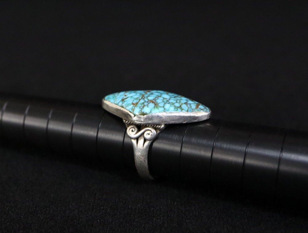 【NAVAJO】ナバホか【PUEBLO】プエブロののビンテージジュエリー、シンプルで伝統的なディテールで構成されたシルバーワークをベースに、Rhombus Shape/菱型にカットされた大変美しい【Nevada Blue Turquoise】ネバダブルーターコイズがマウントされたアンティーク/ビンテージリングです。