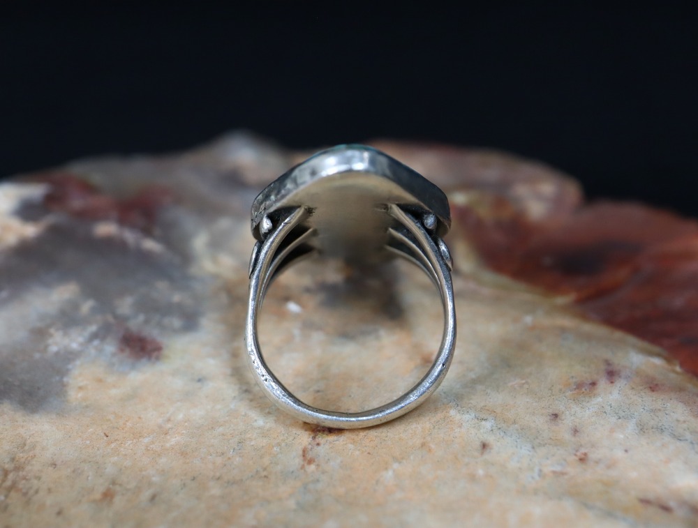 インゴットシルバー(銀塊)から成形されたと思われるシャンクは、サイドからフロントに向かって3本に割り開かれた『スプリットシャンク』と呼ばれるナバホの伝統的なスタイルに造形されています。
