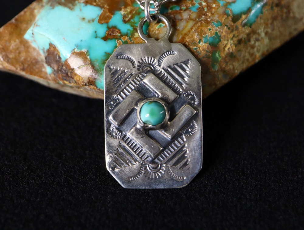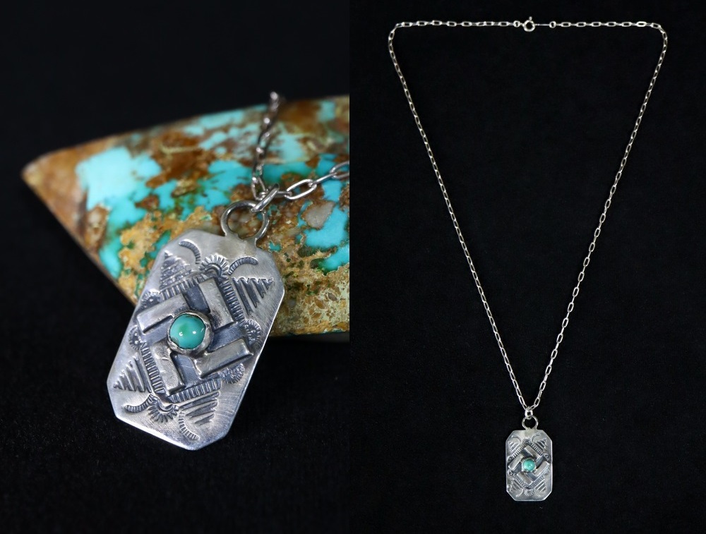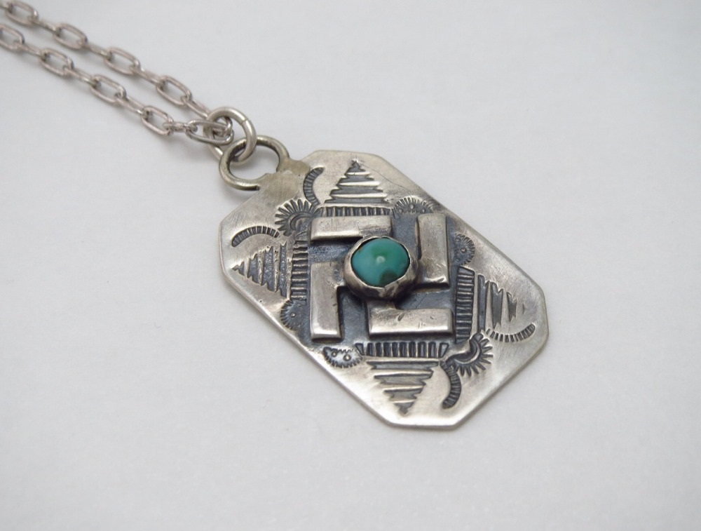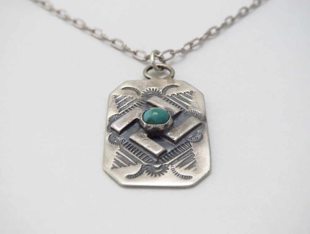 【NAVAJO】ナバホのアンティークジュエリーで、シルバータグをベースに【卍】Whirling Log/Nohokosのアップリケ/パッチワークや力強いスタンプワークが刻まれた作品。伝統的なアイテムながら非常に現存数の少ない貴重なアンティーク/ビンテージネックレスです。