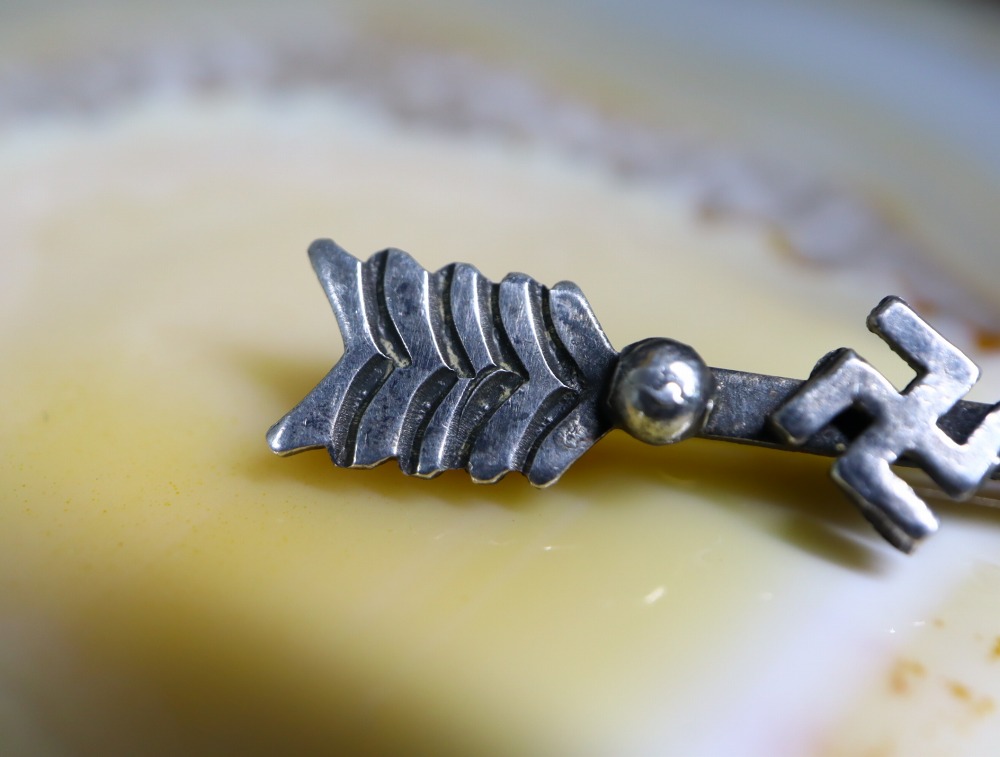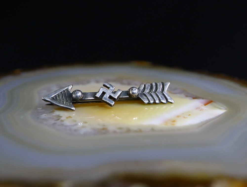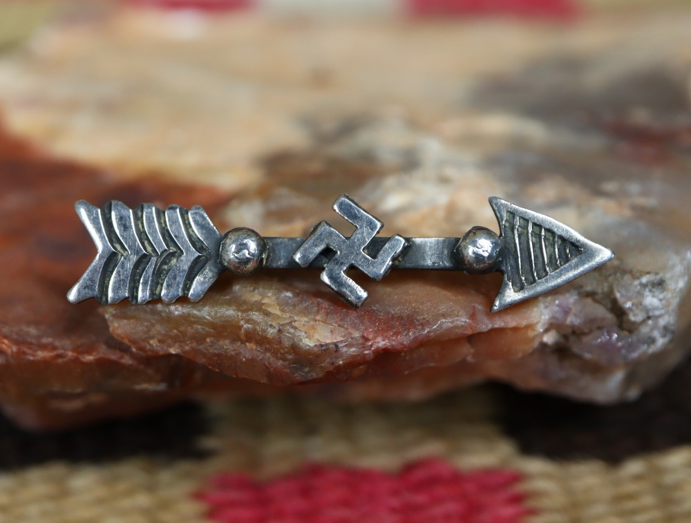 【Tourist Jewelry】ツーリストジュエリーや【Fred Harvey Style】フレッド・ハービースタイルと呼ばれる、20世紀前半のサウスウエスト観光産業の隆盛に合わせスーベニアアイテム(土産物)として作られた、アローシェイプに【卍】Whirling Logが組み合わせられた小さなアンティーク/ビンテージピンブローチです。