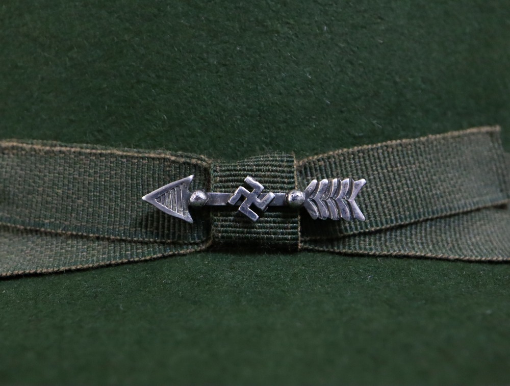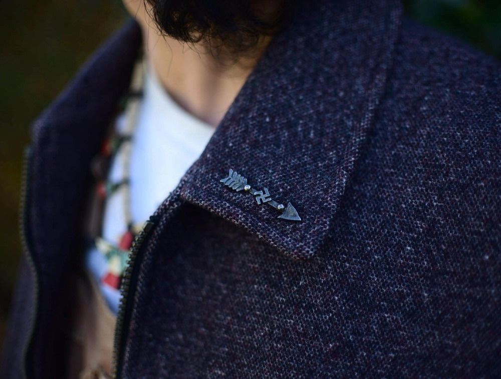 また小さなサイズ感やビンテージアイテムと大変相性の良いアローシェイプは、多くのスタイルにフィットさせることが出来る汎用性を持っており、アウターのアクセントととして、ラペルや襟等にもフィットしますし、ハット等のワンポイントにも使い勝手の良いピースです。