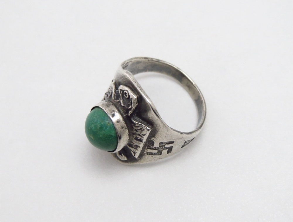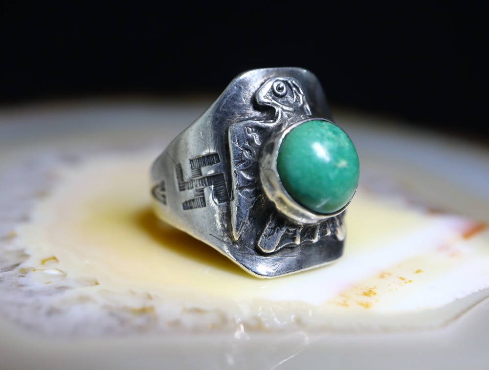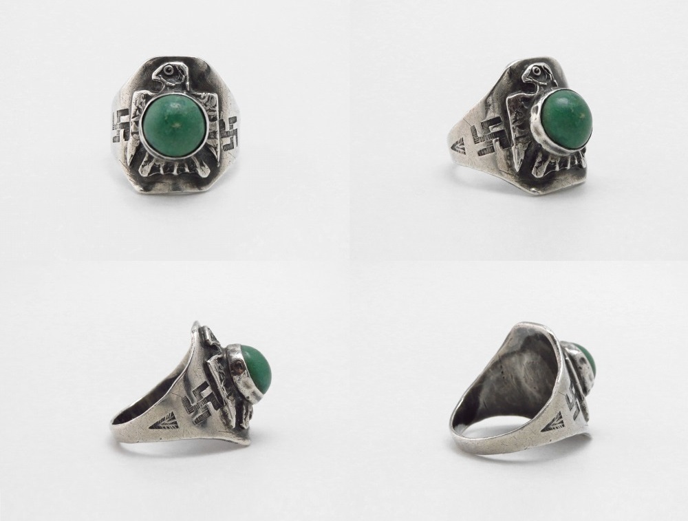 【NAVAJO】ナバホのアンティークジュエリー、【Fred Harvey Style】フレッド・ハービースタイルや【Tourist Jewelry】ツーリストジュエリーと呼ばれる、20世紀前半頃にアメリカ中西部の観光客向けに制作されたスーベニアアイテム(土産物)の一つ。サンダーバードのアップリケがメインに構成され、サイドに刻まれた【逆卍】Whirling Log/Nohokosの刻印も象徴的なアンティーク/ビンテージリングです。