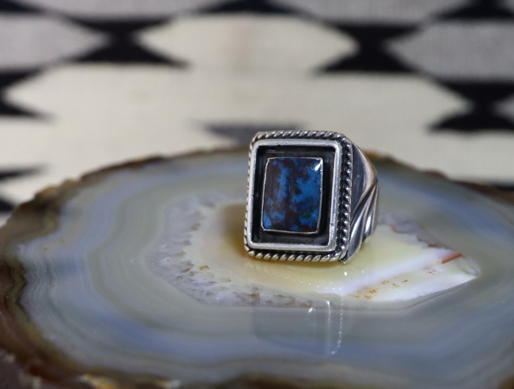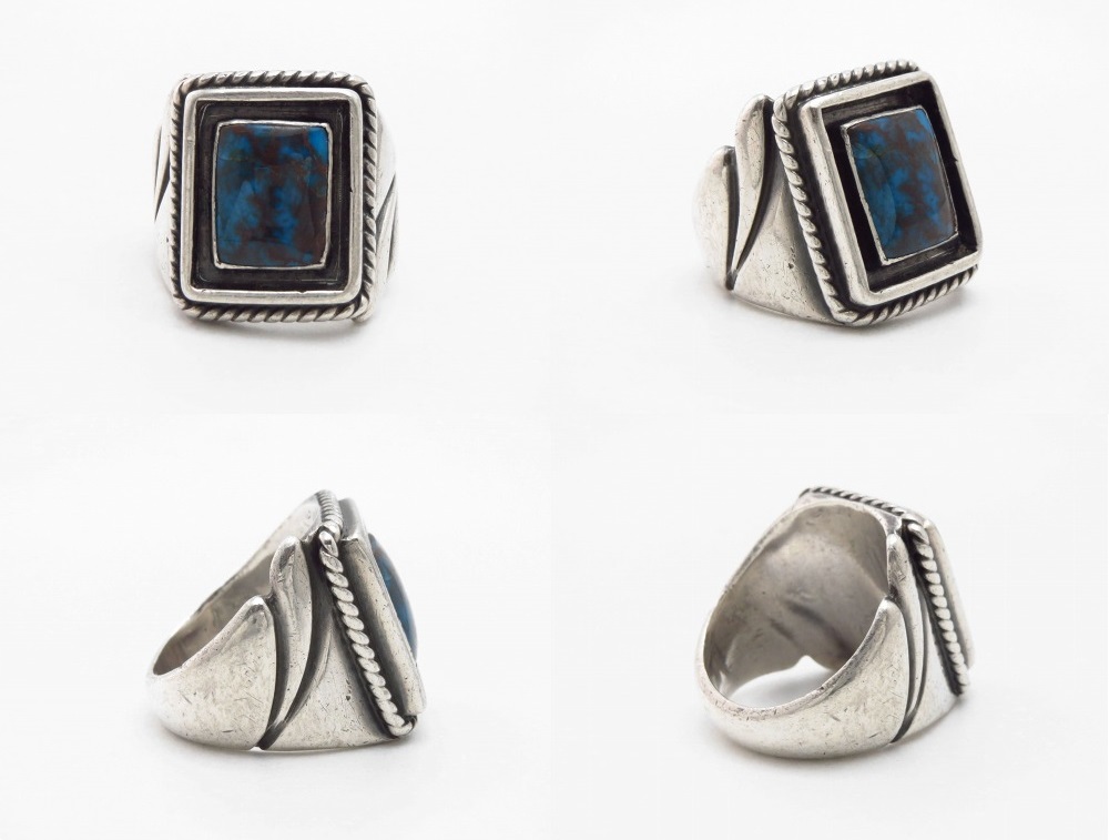 ナバホの伝統的な技術とFred Thompsonらしい流麗な造形で構成され、重厚なシャンクはキャストではなく丁寧なカッティングやスタンプワークで形作られており、そのボリューム感を持ち重厚なフォルムは、シールリング(印台型)に近い造形/デザインに構成される事により、クラシックな印象となっています。