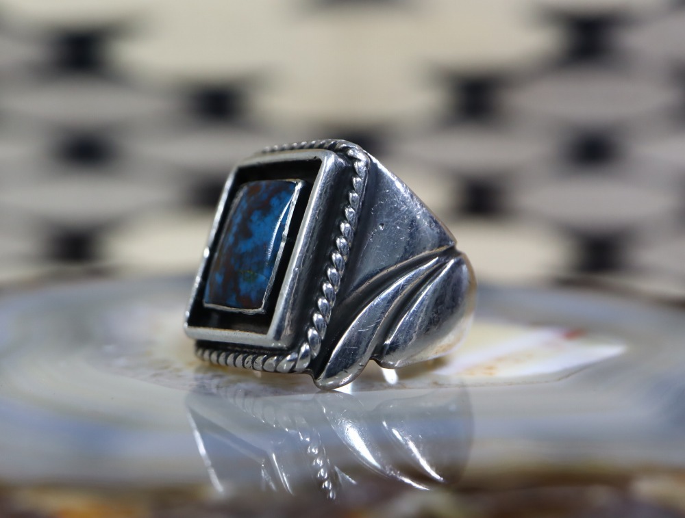【NAVAJO】ナバホの巨匠【Fred Thompson】フレッド・トンプソン(1921or1922-2002)の作品で、大変美しいハイグレードビズビーターコイズをメインとし、シンプルながら力強い迫力を持ったシルバーワークによって仕上げられた作品。同作者らしい造形と完成度を誇るアンティーク/ビンテージリングです。