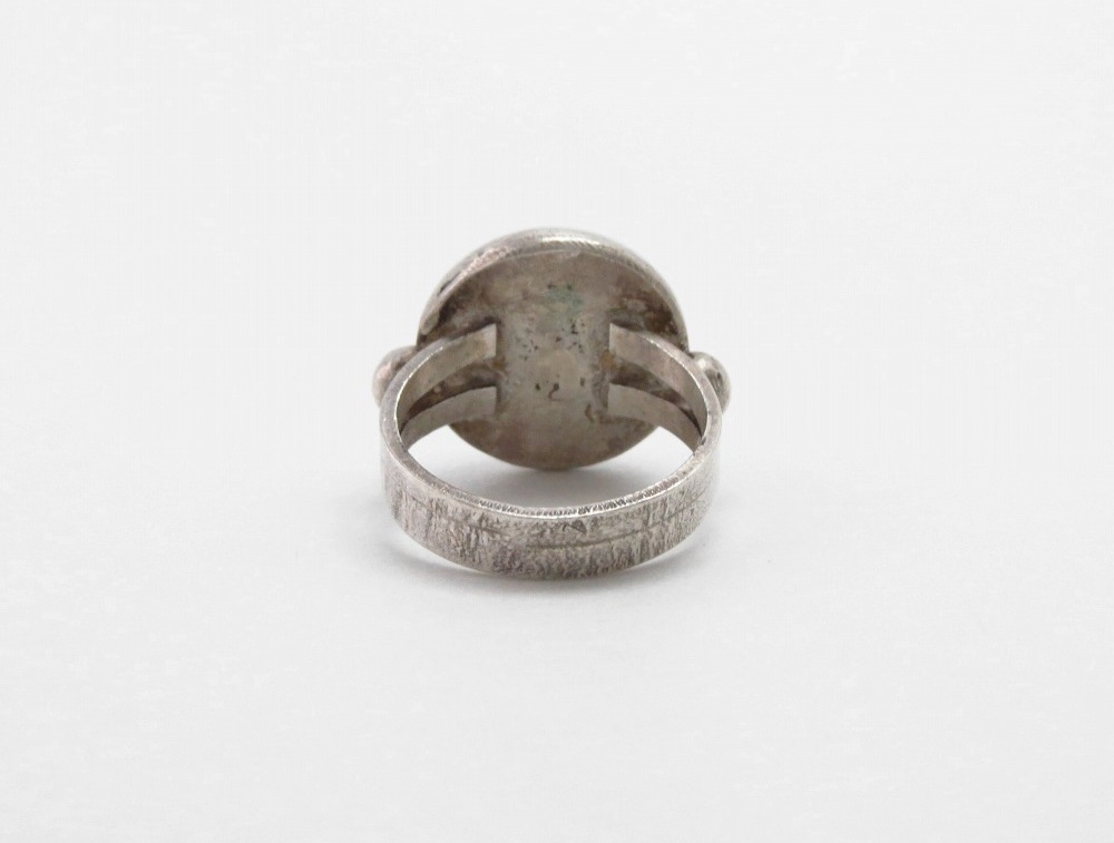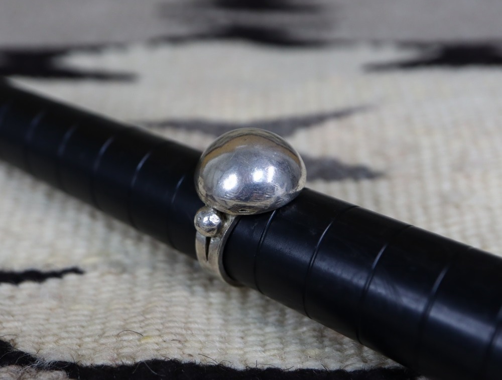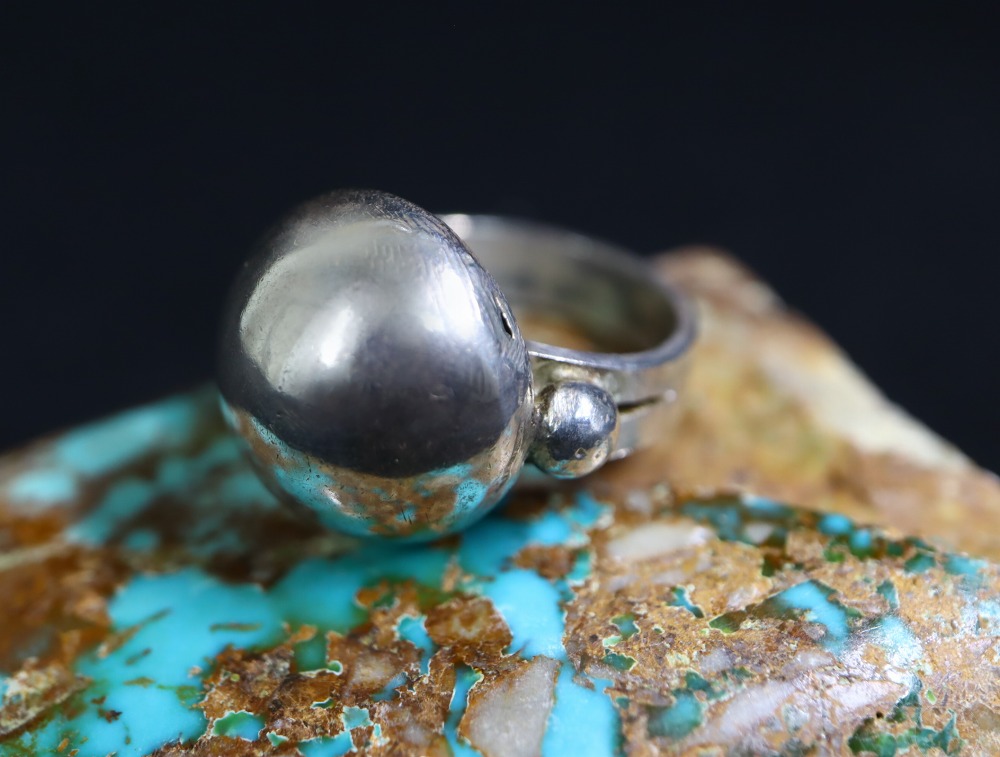 素朴なハンドメイドの味わいと、高度なシルバーワークによる立体的なシルバービーズのボリューム感が織り成す独特な存在感と質感が魅力的なリング。オーセンティックなスプリットシャンクなどのディテールによって素朴なナバホジュエリーの表情やビンテージ独特の味わいも感じられる作品であり現在では大変貴重なピースの一つとなっています。