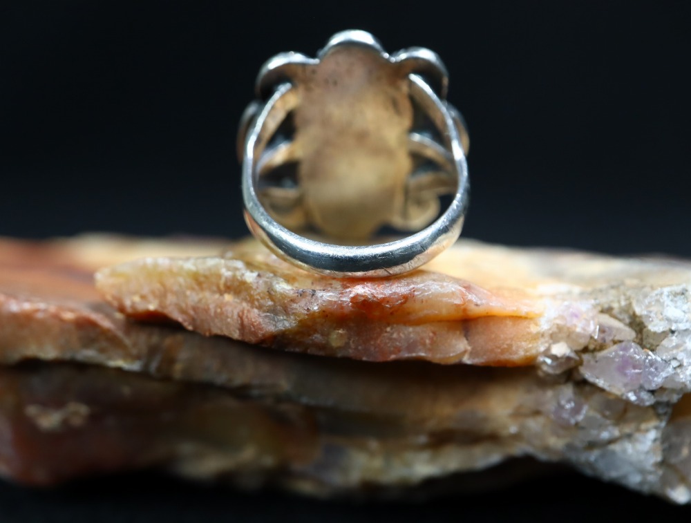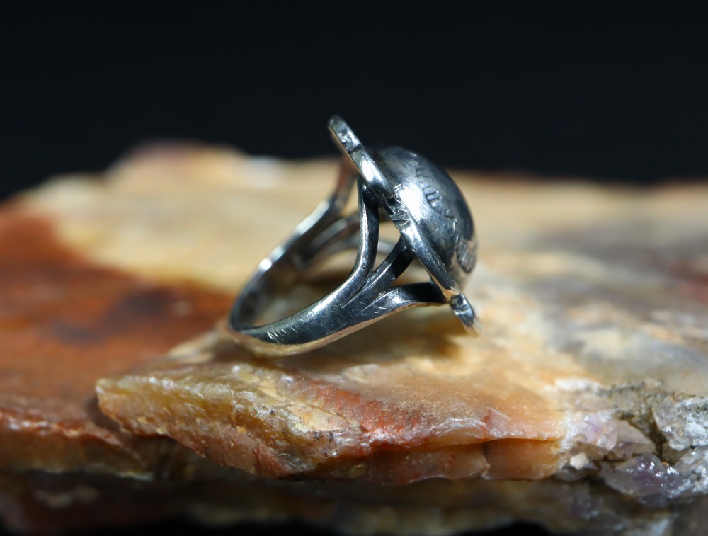 1930年代~1950年代前半頃に作られた作品と思われ、インゴットシルバー(銀塊)から成形されたシャンクは、『スプリットシャンク』と呼ばれる伝統的な造形で3本に割り開かれ、フェイスに向けて少しずつ幅が広く造形されることでフェイスとの自然な繋がりを作り上げています。
