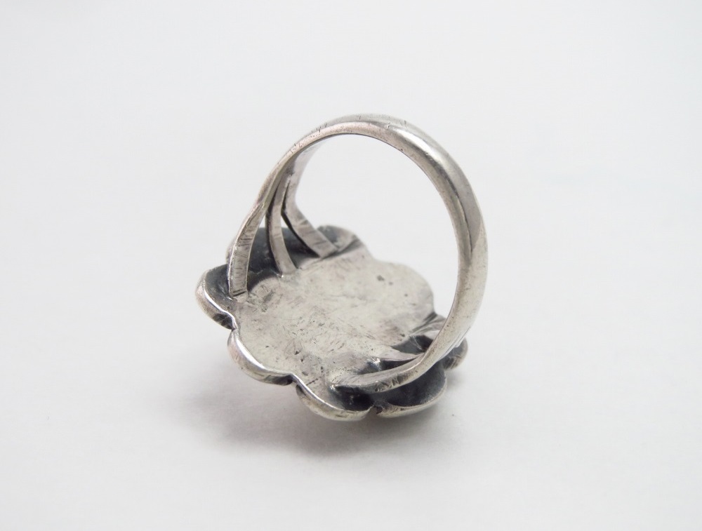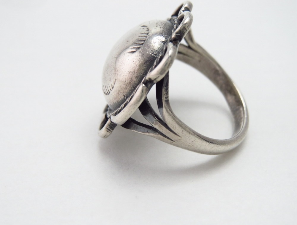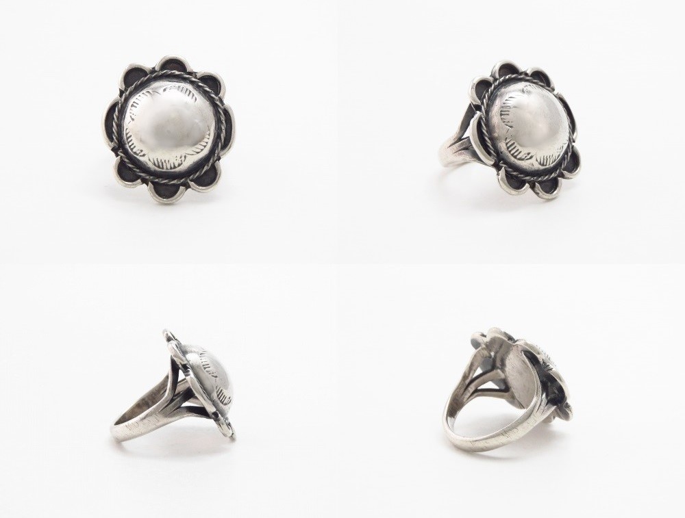 伝統的なフラワーコンチョの意匠を踏襲しながらも現在のインディアンジュエリーとは違った独創性を持ち、素朴で愛らしい印象を与えるリング。その小さいサイズも特徴的で貴重な作品です。