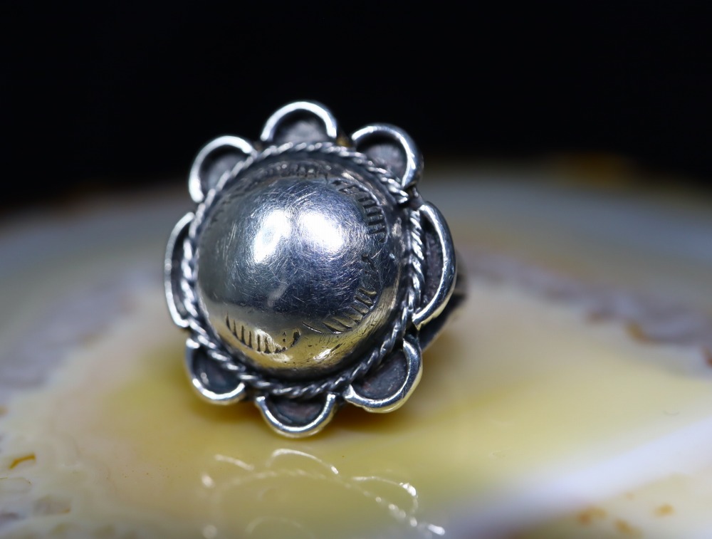 【NAVAJO】ナバホか【PUEBLO】プエブロのアンティークジュエリー、シルバービーズ(半球体)をフェイスに構成し、ワイヤーワークを組み合わせることでフラワーコンチョの様な造形が形作られたアンティーク/ビンテージリングです。