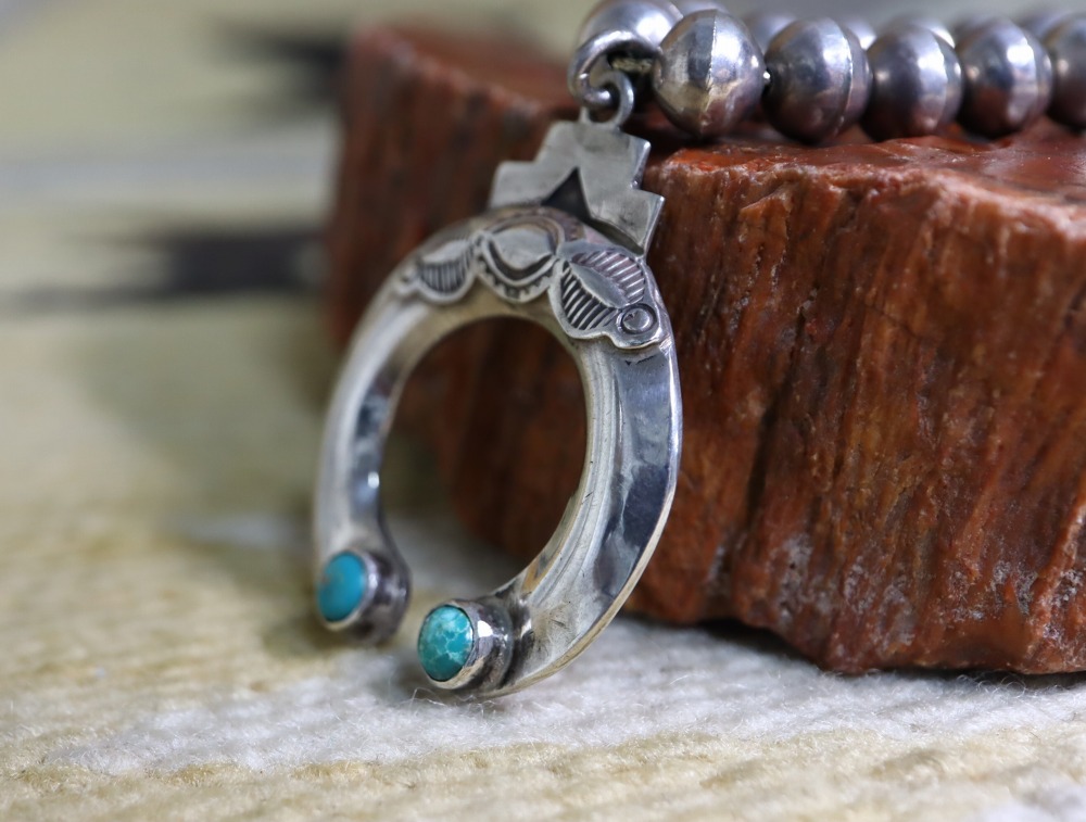 また、ナバホのシルバースミスによる作品である可能性を完全に排除する事は出来ませんが、ナジャの上部に施されたレインクラウド/雨雲等をモチーフとした凸形の意匠やスタンプツール、ホロースタイル(中空構造)で造形されたナジャの造形等から、ナバホのシルバースミスではなく1950年代以前のホピ族のシルバースミスによる作品である事が推測されます。