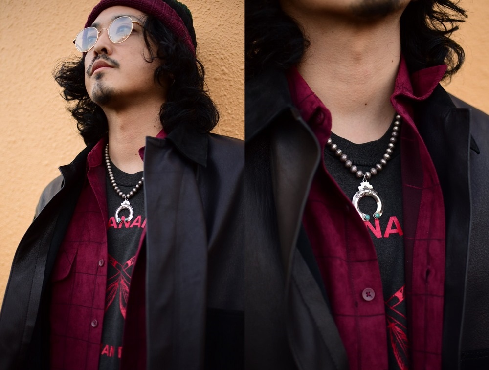 インディアンジュエリーらしい素朴でナチュラルな印象を与え、控えめなサイズにより性別やコーディネートと問わず取り入れて頂きやすく、程よい立体的を持ったタイムレスな造形美は多くのスタイルに馴染みやすい印象。女性には遊び心を感じながらもエレガントにもフィットしますし、男性にもさりげなくお使いいただける汎用性の高いネックレスです。