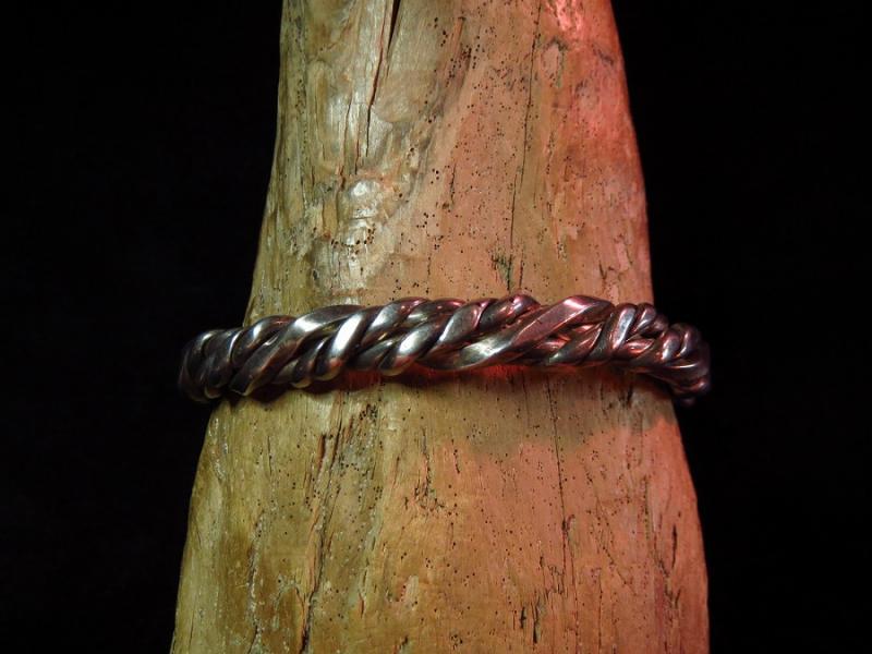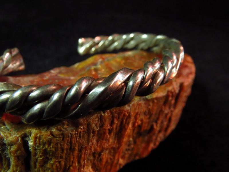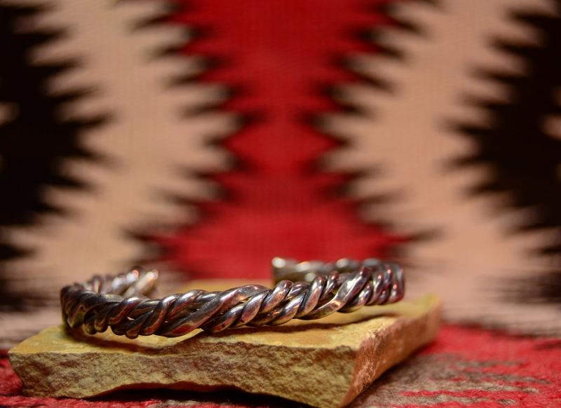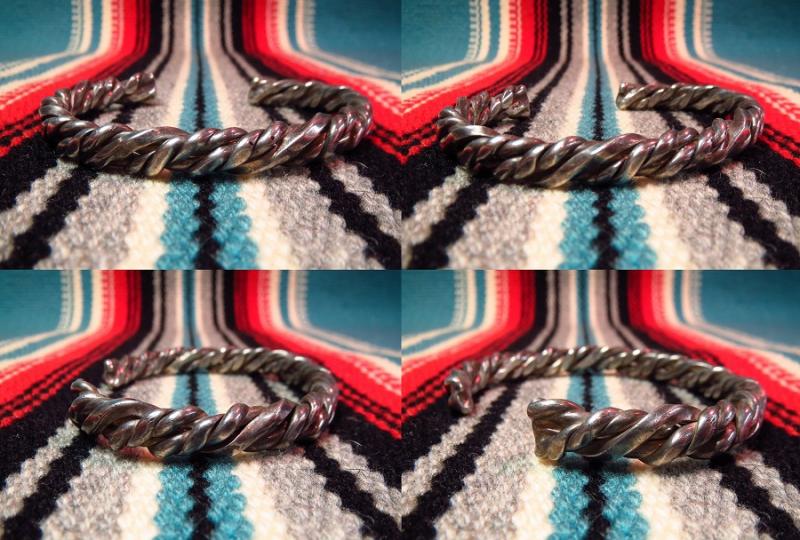 インディアンジュエリーの中でもナバホの伝統技法であるツイステッドワイヤーの作品は古くから伝統的な技法で作り続けられているため、正確な年代判定が難しいのですが、1940年代終わり頃~60年代後半頃の作品と思われます。