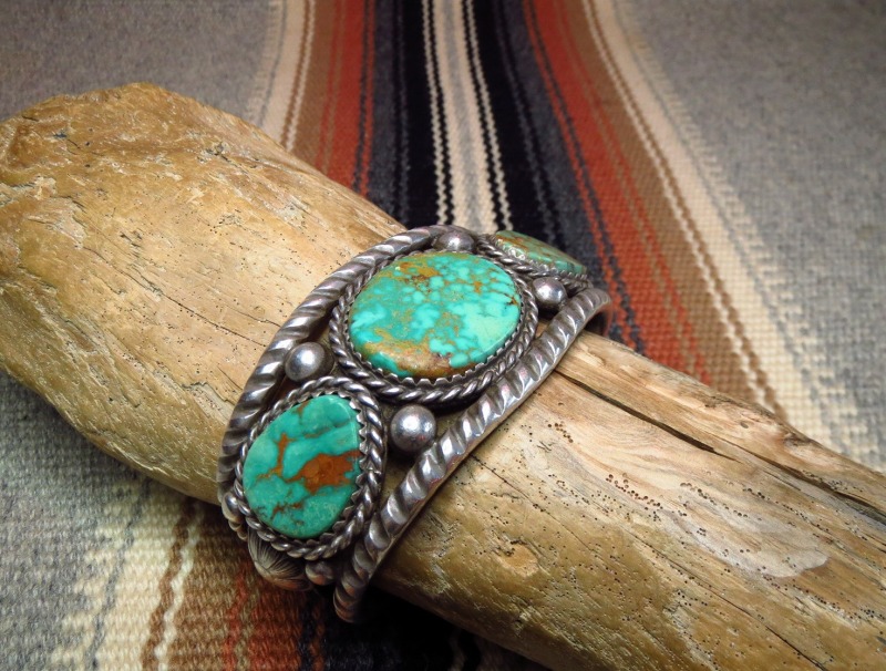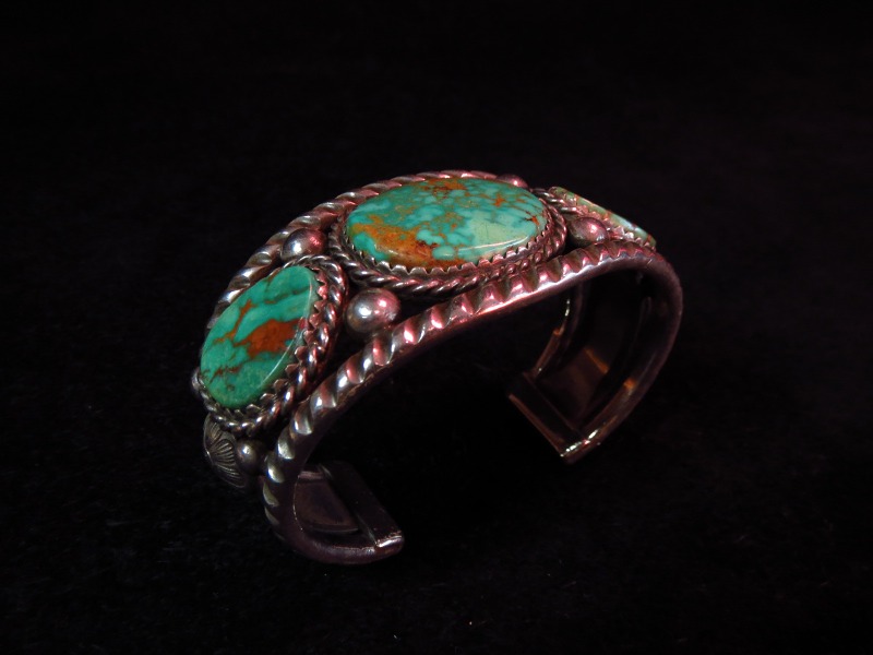 オースティン・ウィルソン独特のスタンプが施されたシルバーワイヤーに挟まれるようにロイストンと思われる美しいターコイズがセットされ、サイドにはこれもオースティン・ウィルソンの特徴的なスタンプが施されたコンチョが施されています。ターミナルにかけてのスタンプワークは当時の作品では散見されるデザインですが、やはり発祥はC. G. Wallaceではないかと推測されます。