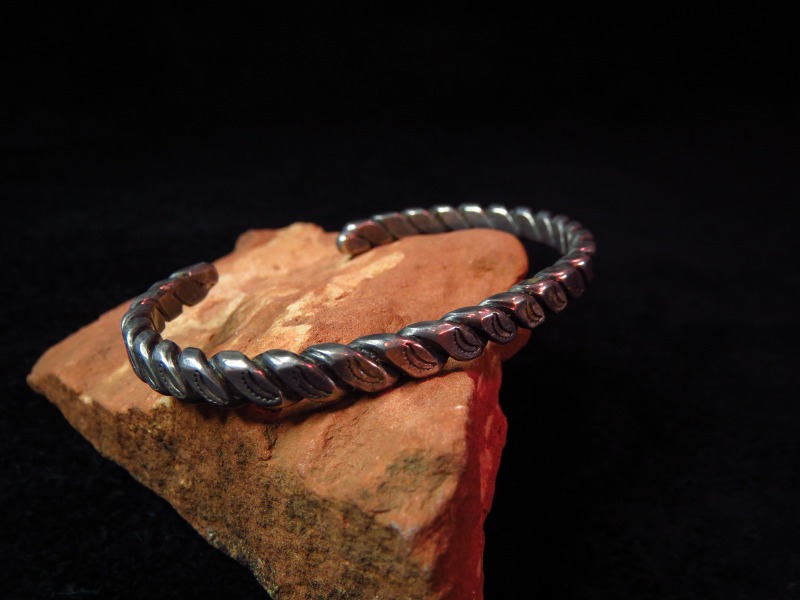 インディアンジュエリーの中でもナバホの伝統技法であるツイステッドワイヤーのシンプルな造形ですが、さらにスタンプワークが施されて味わい深い表情に仕上がっています。 断面がスクエアになるよう叩きのばされており、手首へのフィット感も心地よいバングルです。