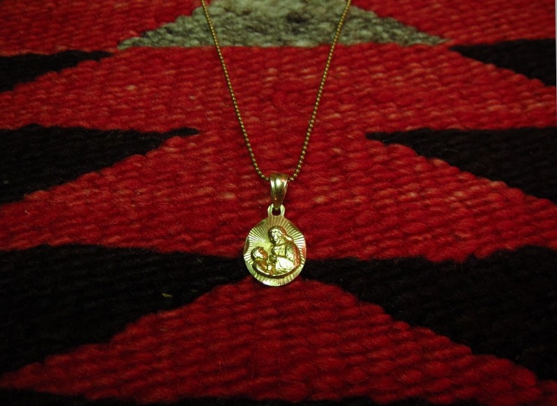 アメリカ南西部やメキシコでは多くの壁画やイコンとしての作品が残されていますが、こちらは金細工によりネックレスに落とし込まれています。