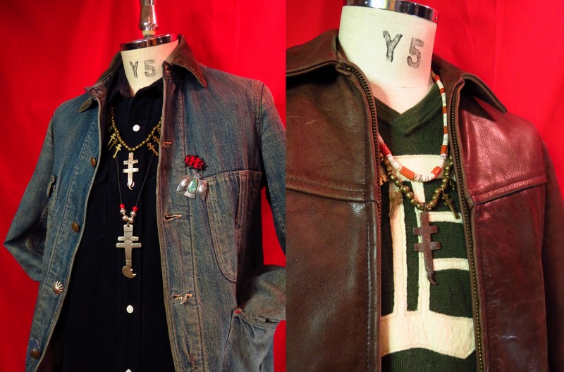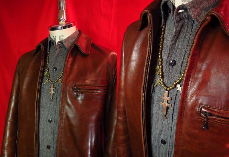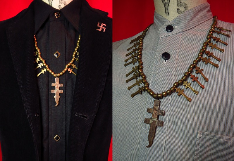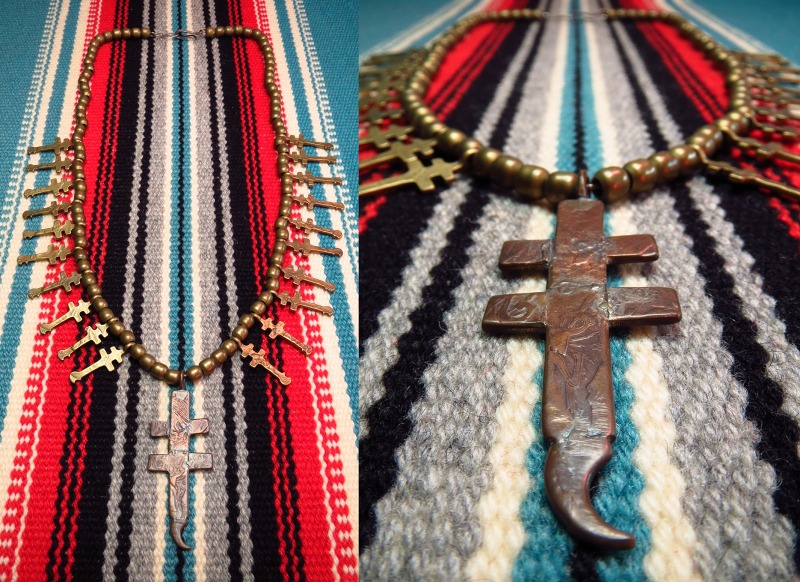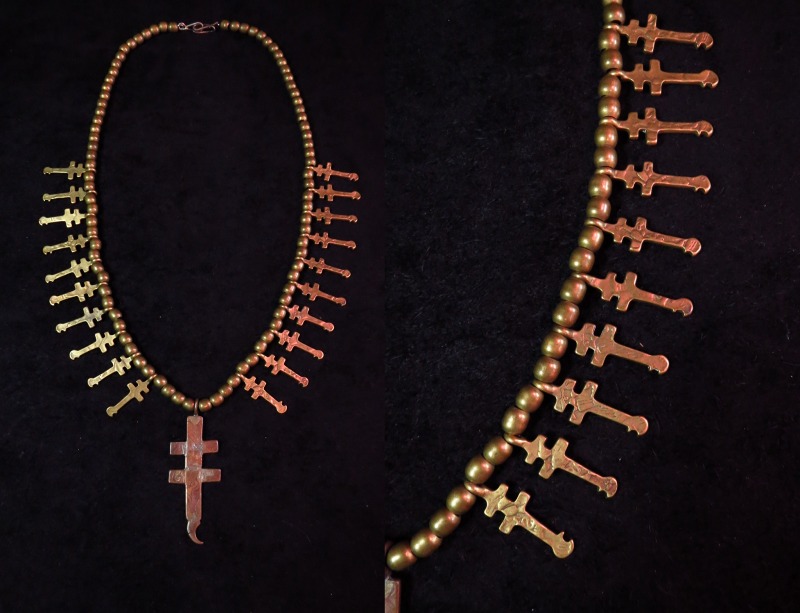 大きいサイズのドラゴンフライクロストップ(こちらはコッパー製と思われます。)に小さなドラゴンフライクロスが左右に10連づつ施され、大変存在感のあるネックレスです。サイズはそれほど大きくありませんが、アンティークコインによる独特の味わいやヘリテイジ感があり、大変な迫力のあるピースです。