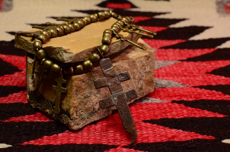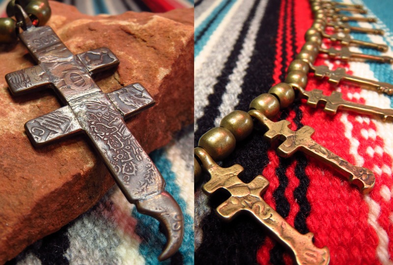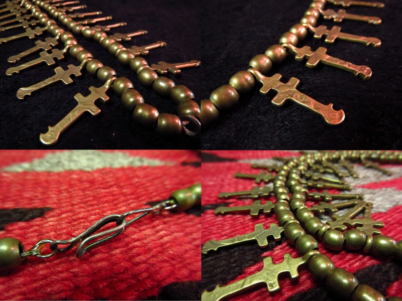 【Pueblo】プエブロの作品で、プエブロコインと呼ばれるトレーディングポストなどが独自に発行していたアンティーク貨幣を素材にしていると思われるドラゴンフライクロスとブラスビーズのネックレスです。